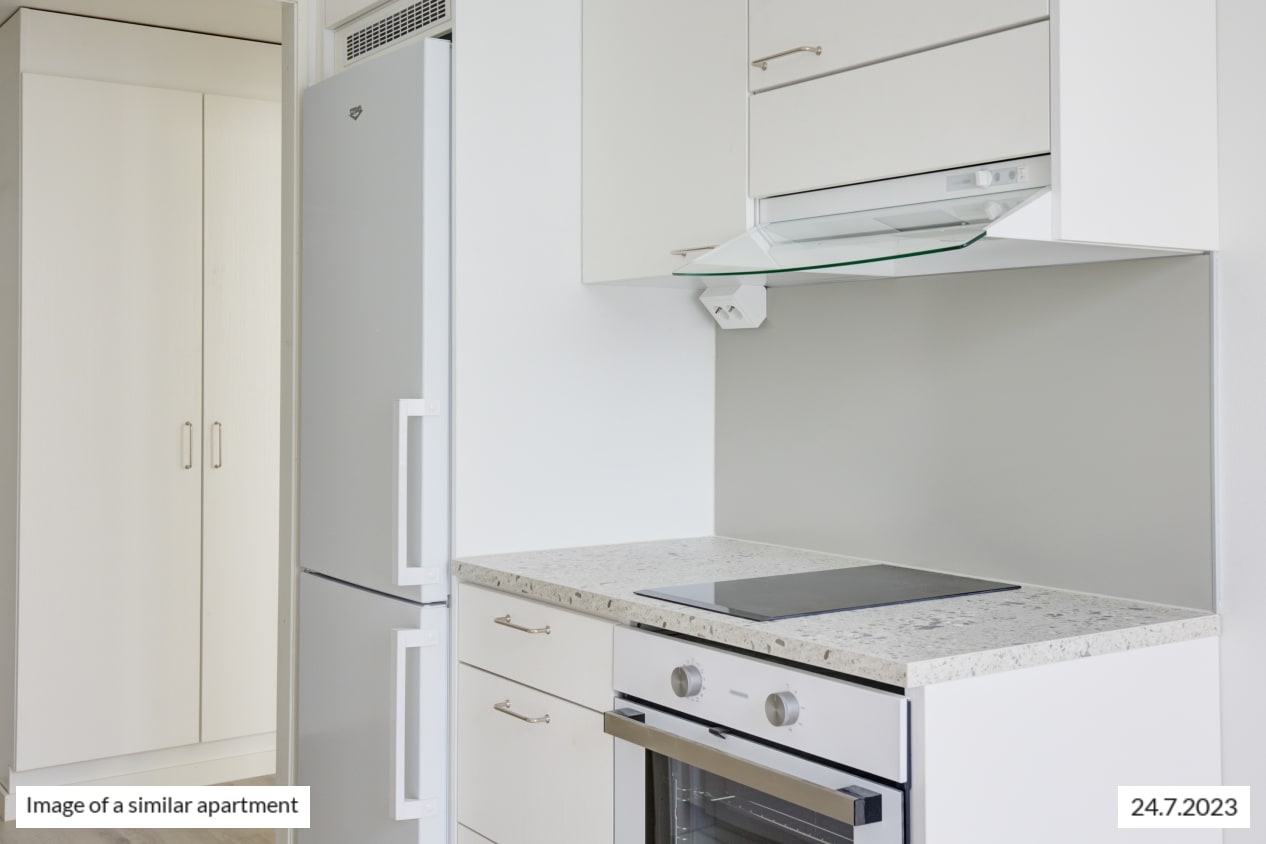 The look of the interiors is calm and provides an easy and neutral backdrop to your personal style. The harmonious kitchen colour scheme reflects the tone of the original stone windowsills. The kitchen units are in white wood-effect laminate, the backsplash pale grey and the countertops in neutral faux stone laminate. The floors are laid in pale grey oak laminate. The fully renovated, fresh bathroom is perfect for a splash in the shower: the walls are in traditional white 15 x 15 cm tiles and the floor in smaller pale grey tiles. The timeless Kide range of bathroom furniture is made in Finland and comes with a 25-year guarantee of durability. There is ground floor bicycle and baby transport storage with direct outdoor access. The housing company also has a clubroom. The heated apartment-specific storage units are in the basement. The property is heated with district heat and locking system is iLOQ. About 60 parking spaces and 4 electrified charging points are also available for rent.