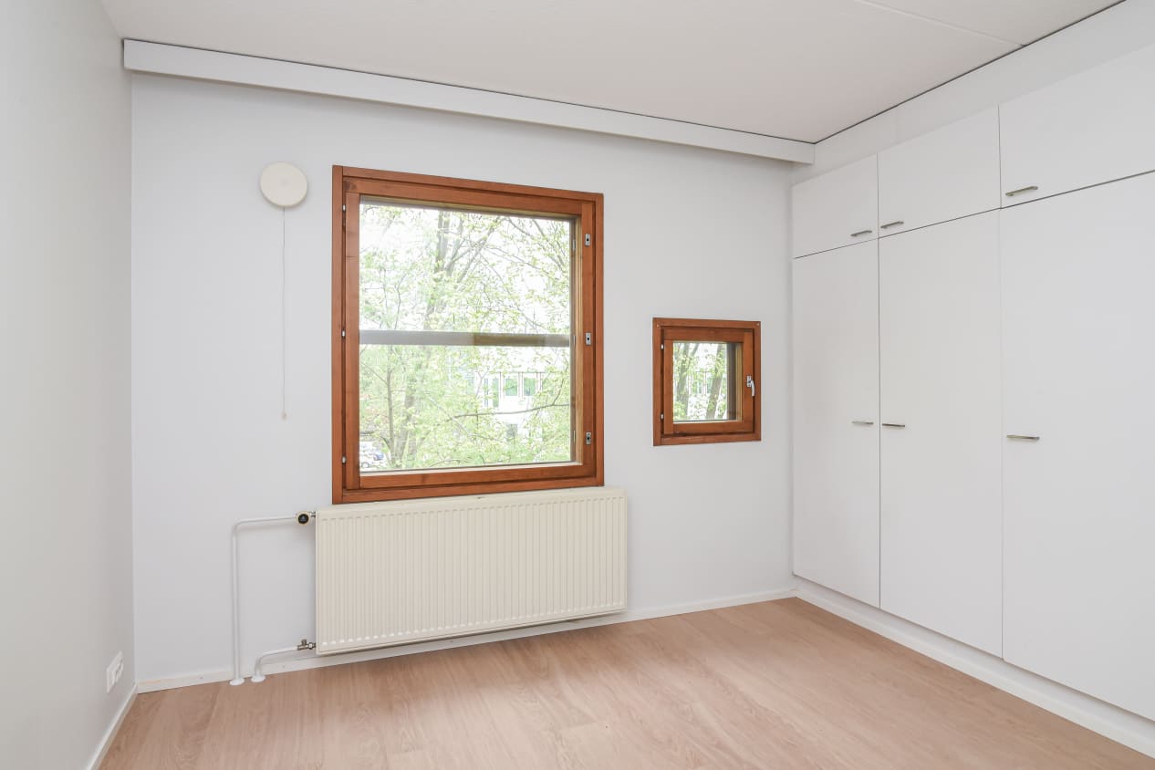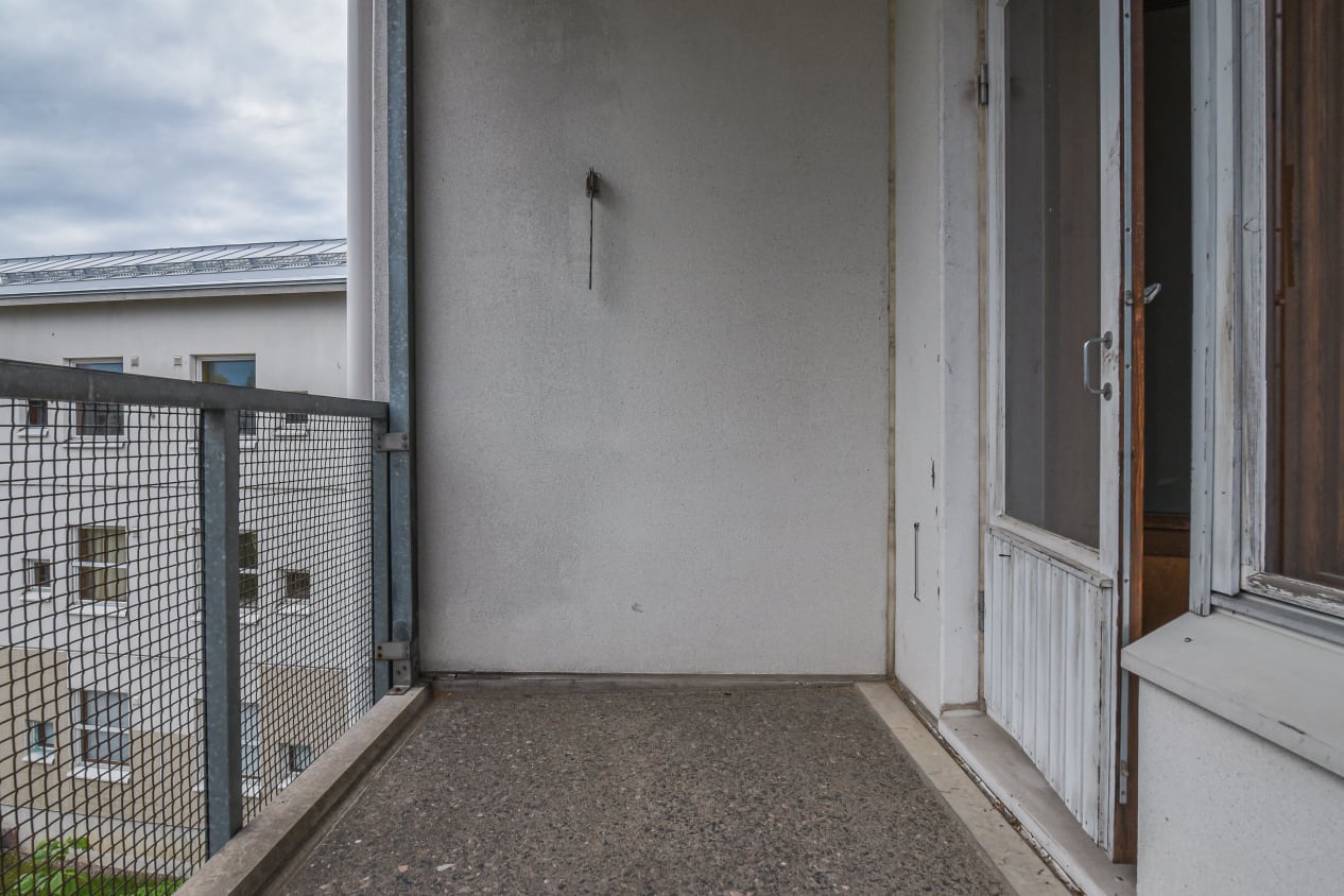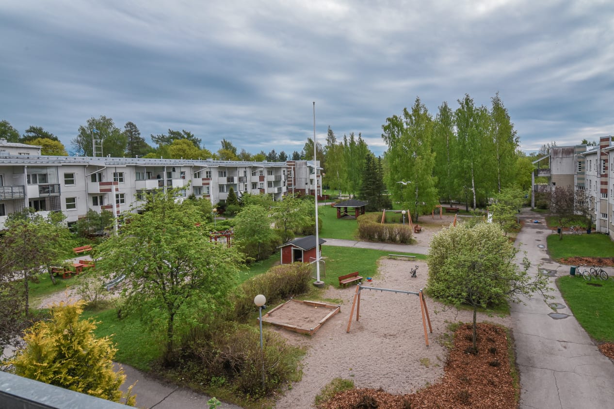 A short walk from Pukinmäki train station, next to the lush Bockinpuisto park, a spacious one-bedroom home awaits new residents, with a balcony opening towards the evening sun.