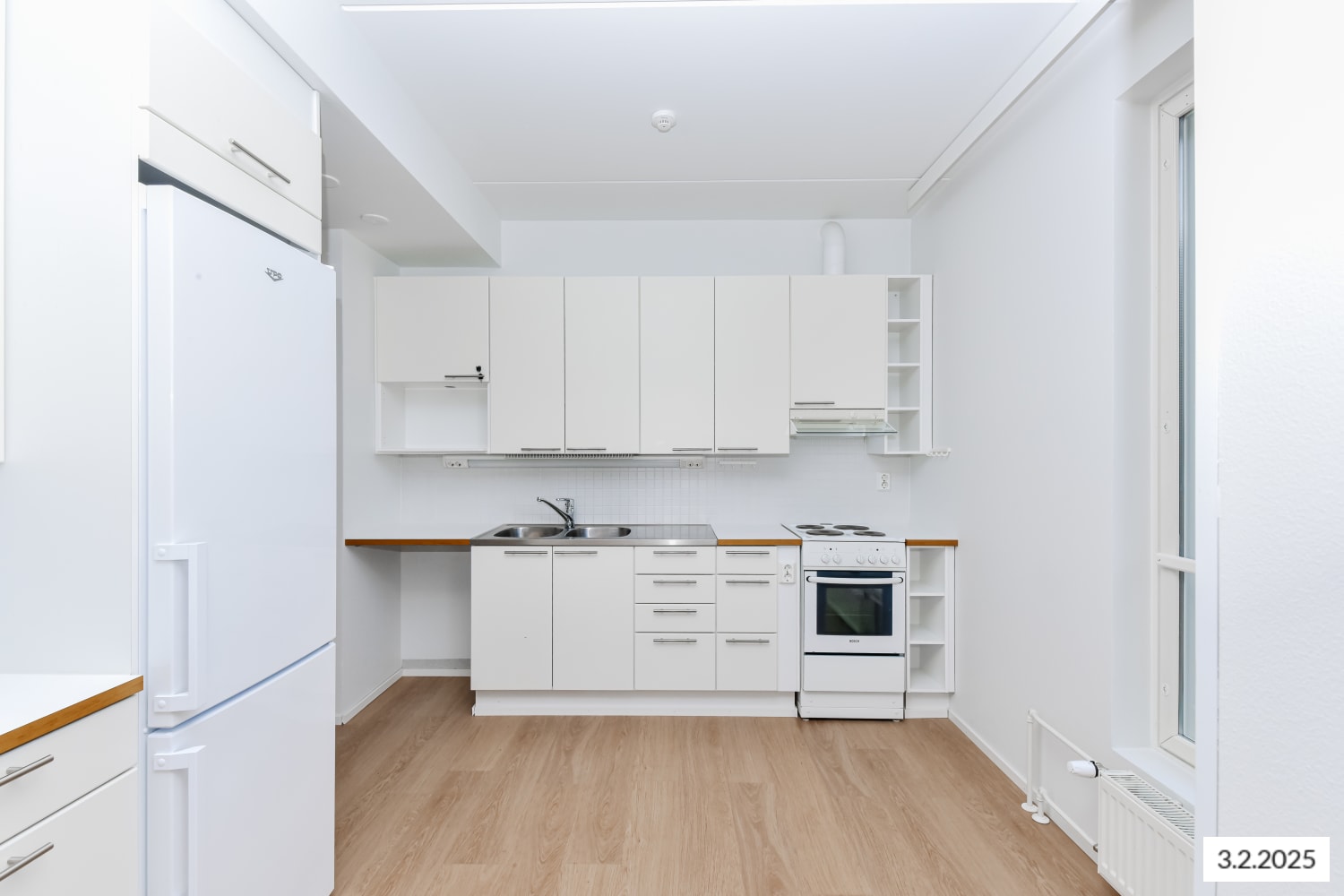 This one-bedroom home, located in a uniquely curved apartment building, caters to mature tastes. The home features a functional layout and a charming juliet balcony. The building is pleasantly situated in the middle of a peaceful block, with apartments offering views of the green courtyard. The kitchen is equipped with a floor oven, a traditional 4-burner stove, and a fridge-freezer. A dishwasher can be installed. Additionally, there is space for a washing machine in the bathroom.