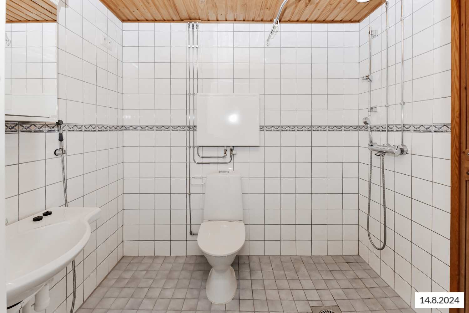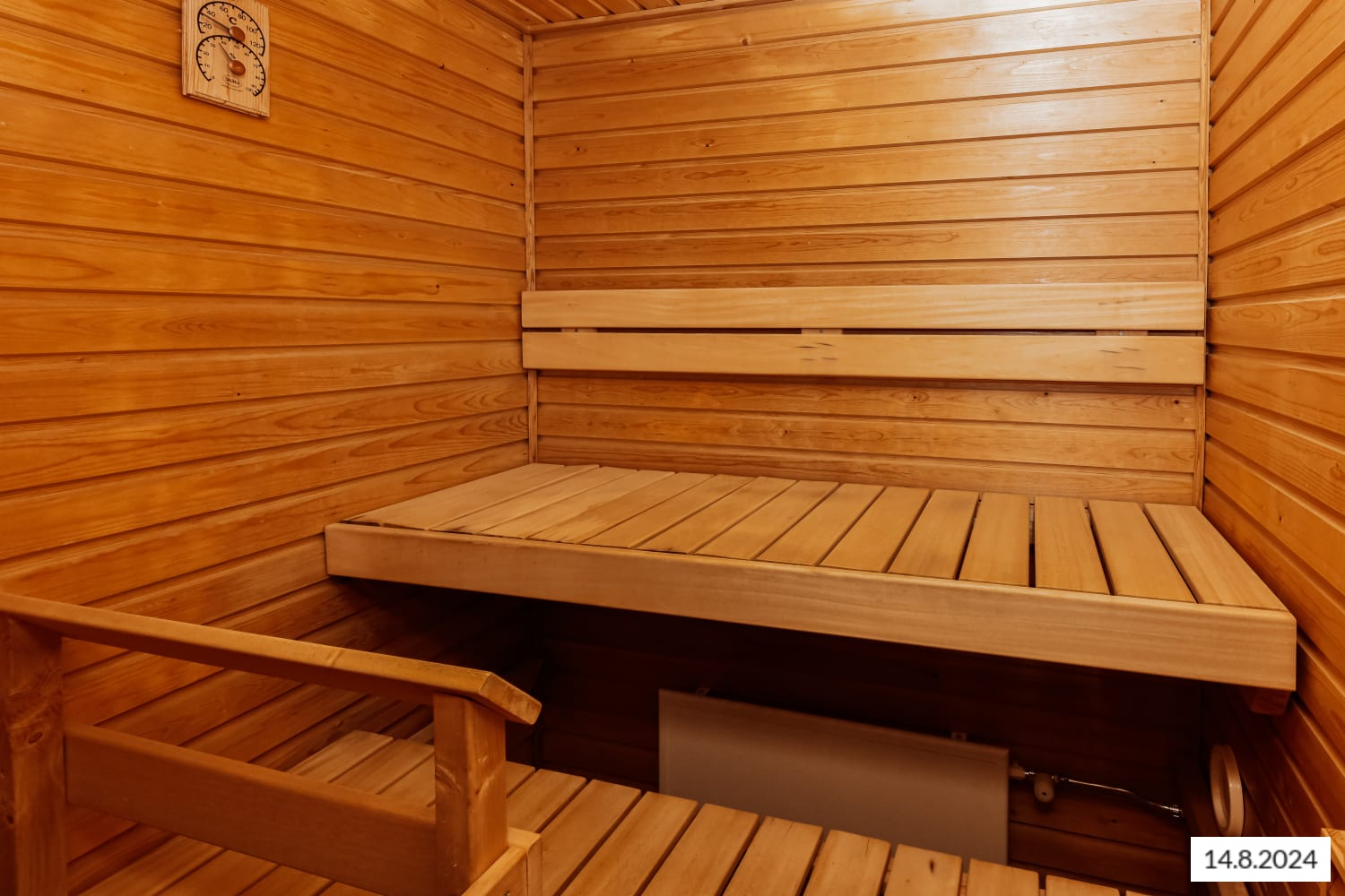 The apartments have parquet floors, cozy light-colored kitchens, and glazed balconies. As a finishing touch, each home includes its own private sauna, where you can relax and unwind. The bathroom features light blue floor tiles, white wall tiles, and a narrow blue-toned mosaic border. The kitchen is equipped with a dishwasher, and the bathroom has a designated space for a washing machine. Residents also have the option to rent a parking space in the garage located beneath the block.
