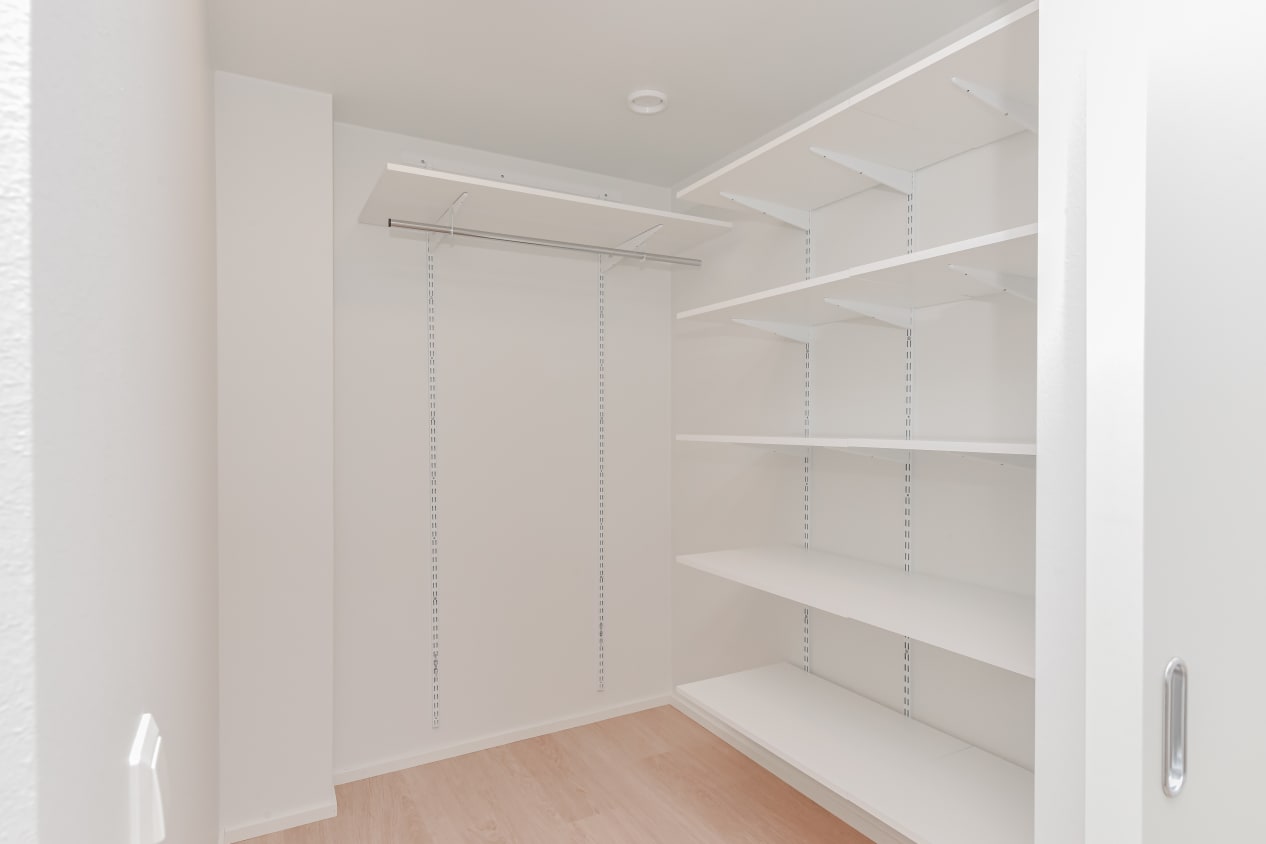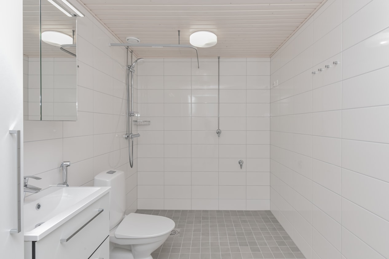 The bathroom features white Kide-model domestic furnishings and a space for a washing machine. The walls are white tiles and the floor is grey. The separate walk-in closet offers ample storage space.