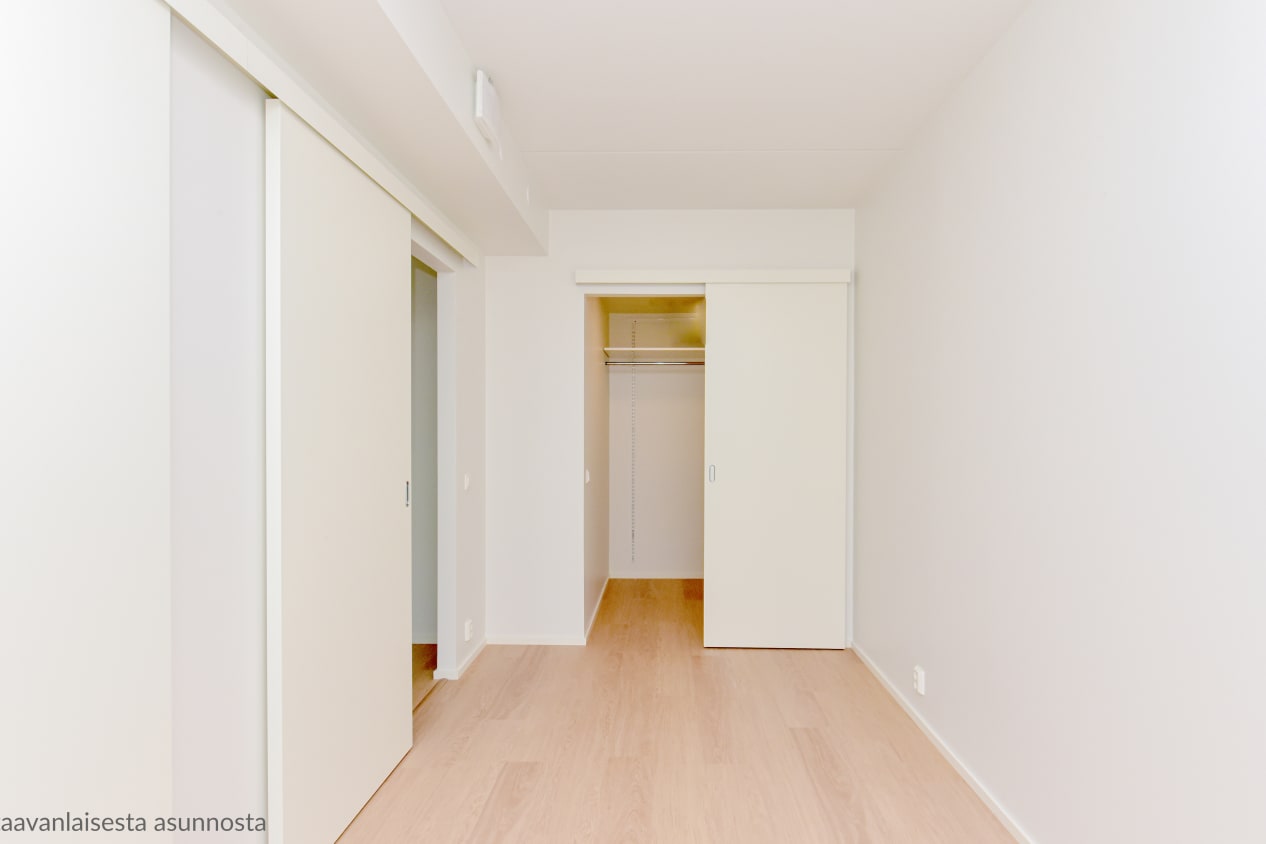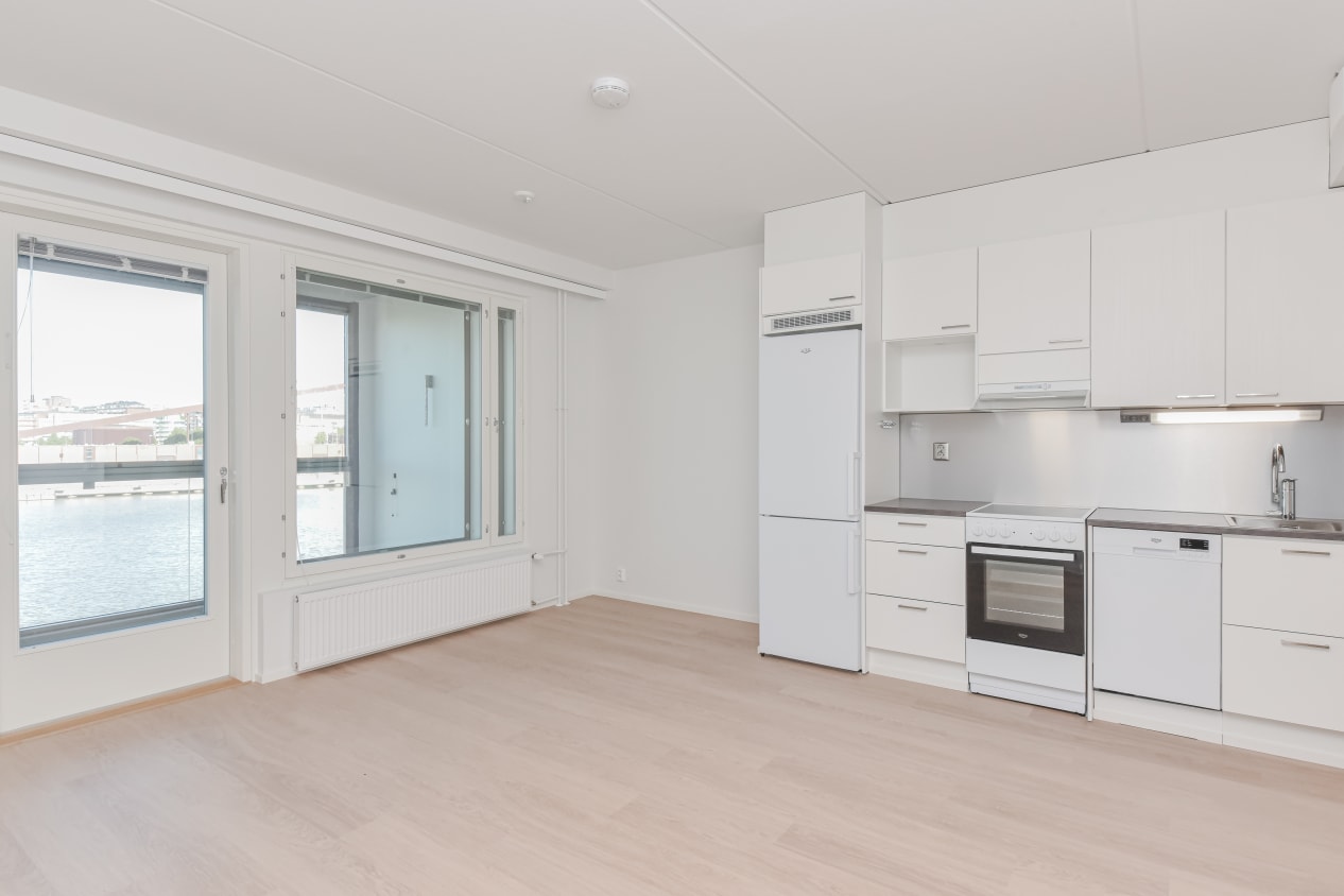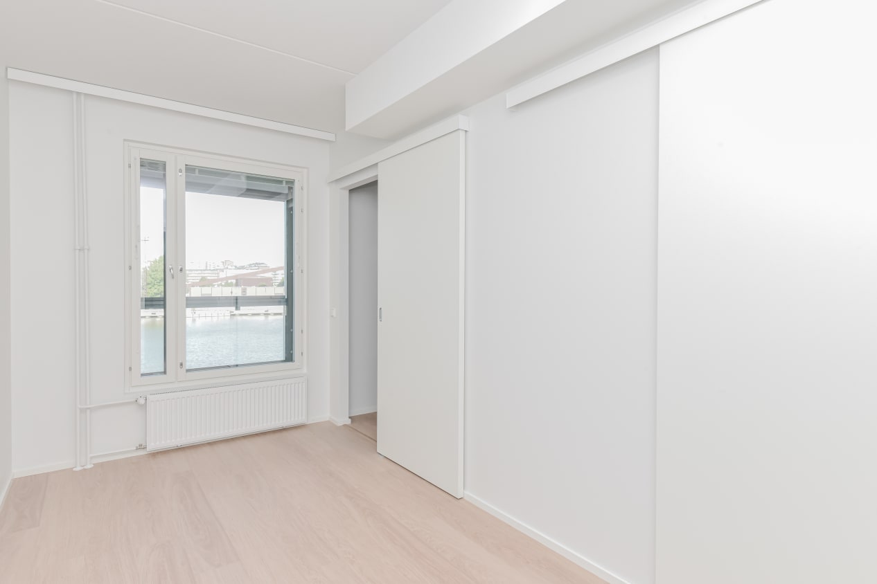 The kitchen and living room of this one-bedroom home, completed in autumn 2021, form a unified bright space that you can easily decorate to suit your taste. The bedroom is separated from the living area by two sliding doors. The full-width glazed balcony opens up to the evening sun facing the Sompasaari basin. The home's surface materials are light and minimalist. The floors are light oak laminate and the walls are painted white.