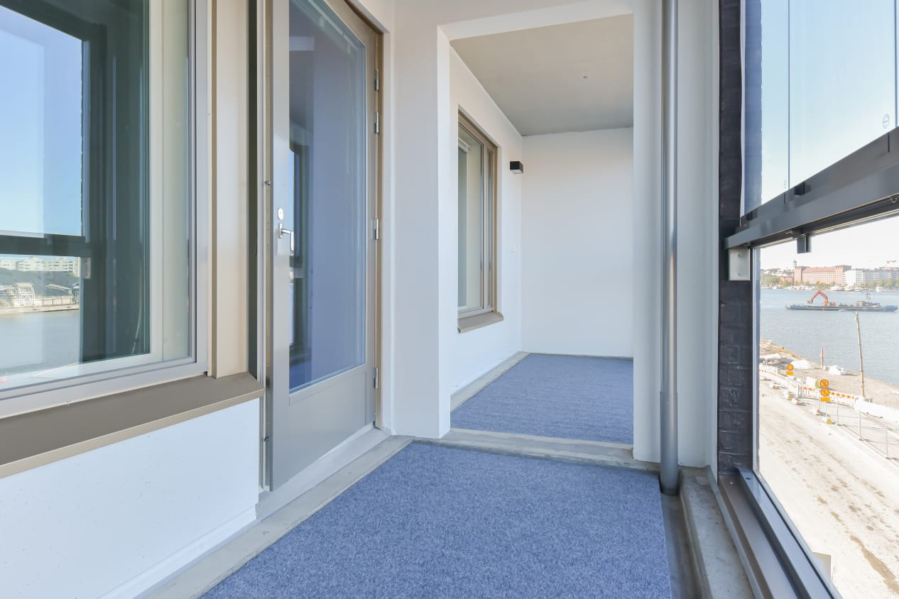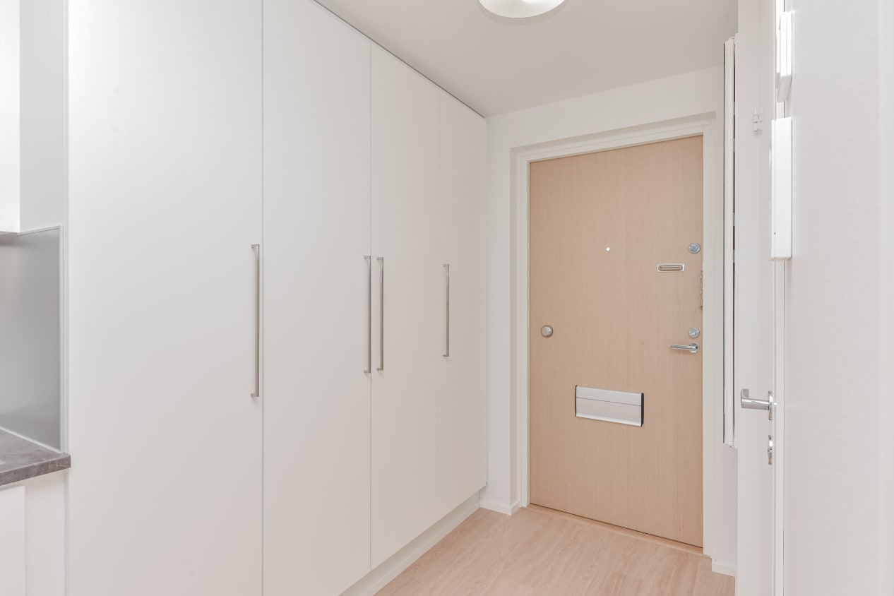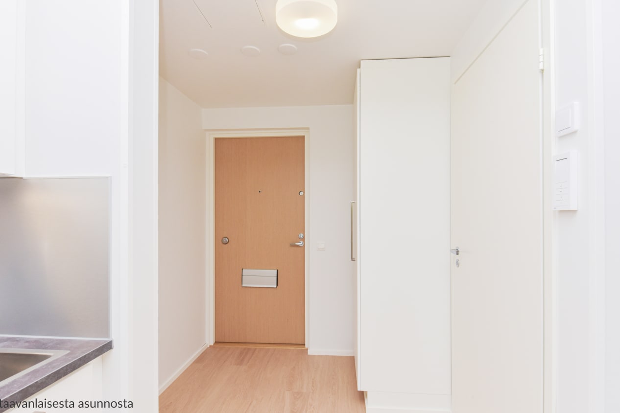The kitchen and living room of this one-bedroom home, completed in autumn 2021, form a unified bright space that you can easily decorate to suit your taste. The bedroom is separated from the living area by two sliding doors. The full-width glazed balcony opens up to the evening sun facing the Sompasaari basin. The home's surface materials are light and minimalist. The floors are light oak laminate and the walls are painted white.
