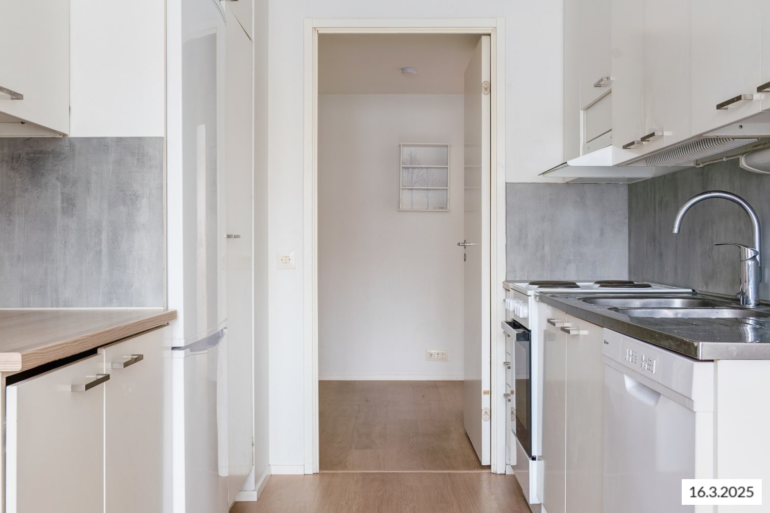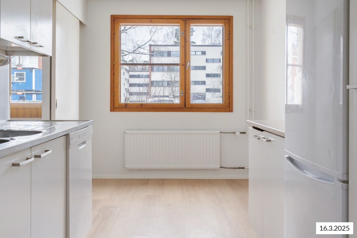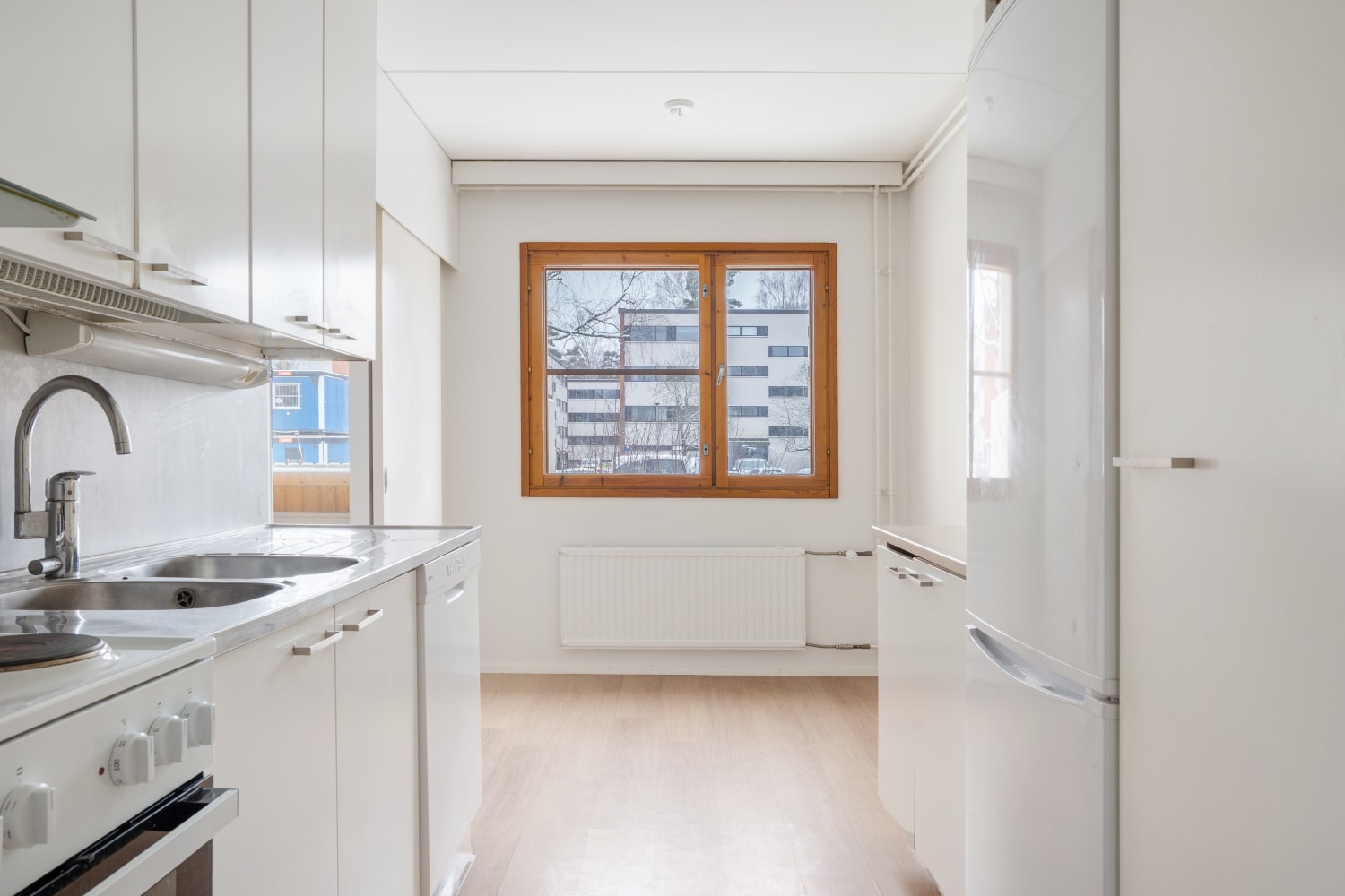Every home in this three-storey building located by a park right by the border between Helsinki and Vantaa has a balcony and a clean and practical layout. There is space for a washing machine in the bathrooms. There are sheltered grounds between the buildings for play and relaxation.