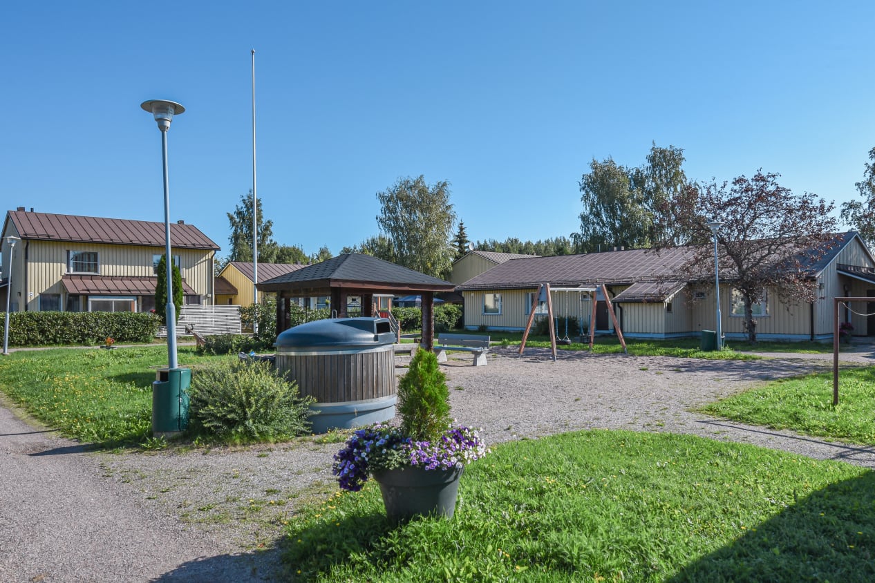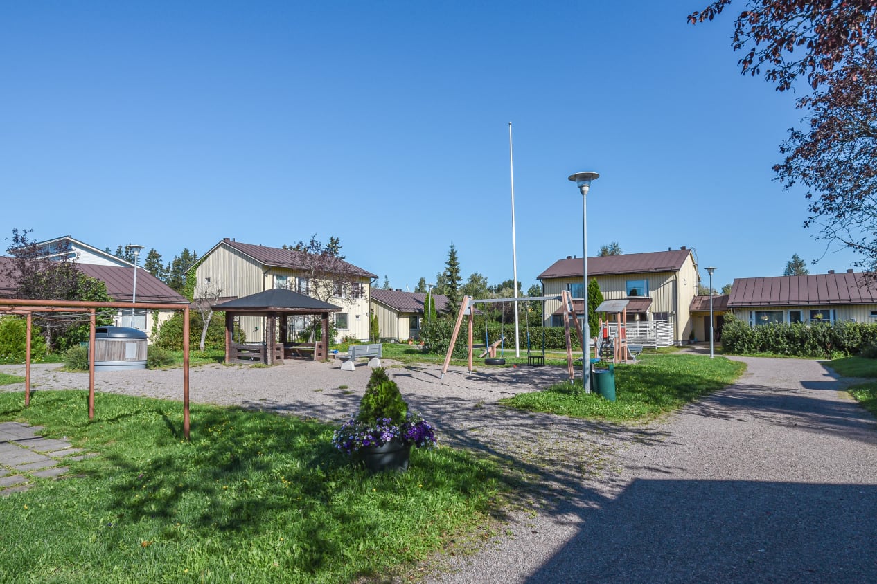 Located right by the border between Helsinki and Vantaa, every unit in this housing company has a private garden and external storage room. There is space for a dishwasher and washing machine in all units.