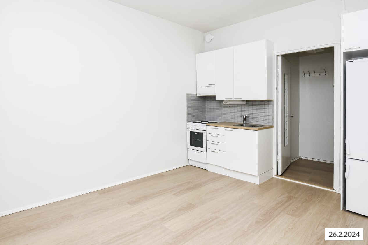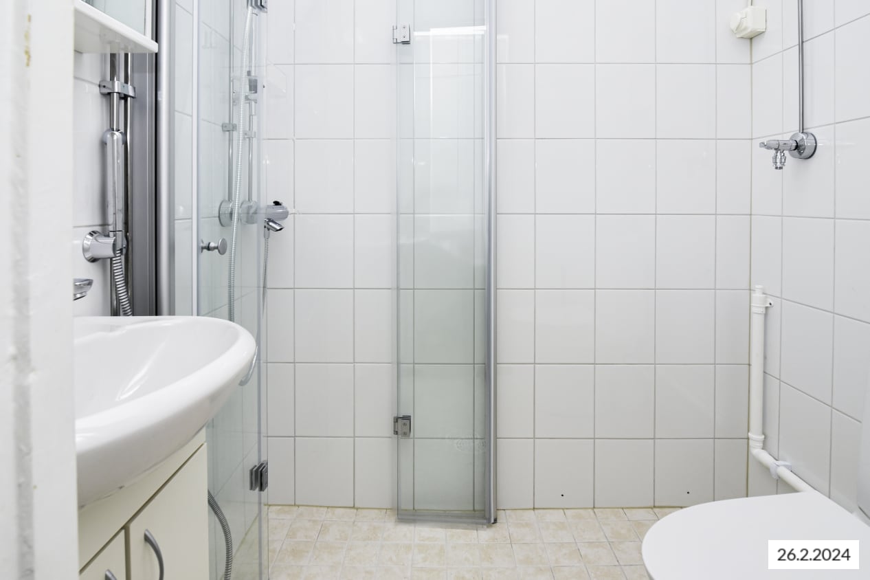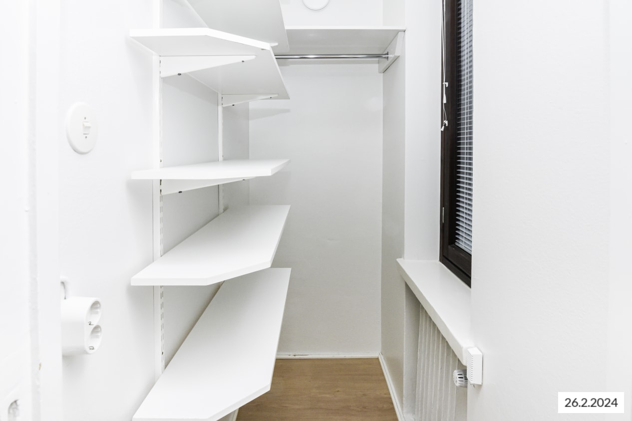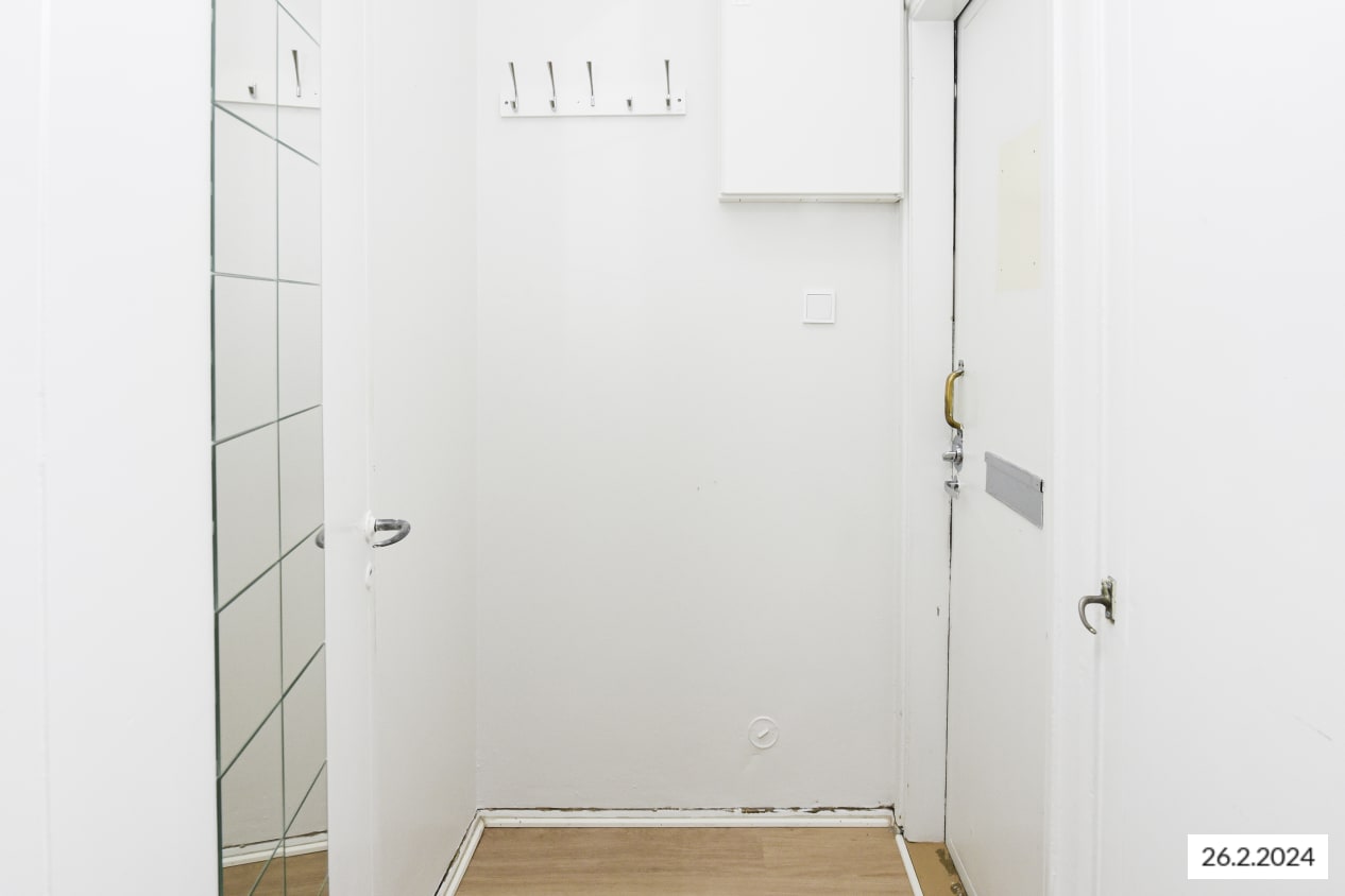 This bright 6th floor studio apartment is facing a quiet courtyard. The room has an open kitchen area. Storage space can be found in the wardrobe with a window.