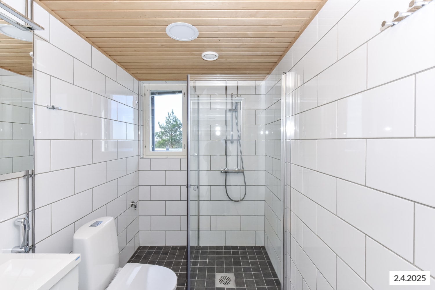 The floors are light-colored oak laminate and the walls are painted white. The kitchen cabinet doors are white and the space between the top and bottom cabinets as well as the worktop are gray laminate. Home appliances are integrated in the kitchen. The bathroom is tiled throughout: the walls have a white, brick-laid tiling and the floor is gray. The stylish bathroom fixtures are made of white laminate. The washing machine and tumble dryer have their own space. All cabinets and closets are domestic production of Kankarin Kaluste.