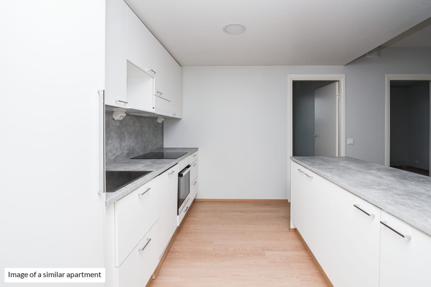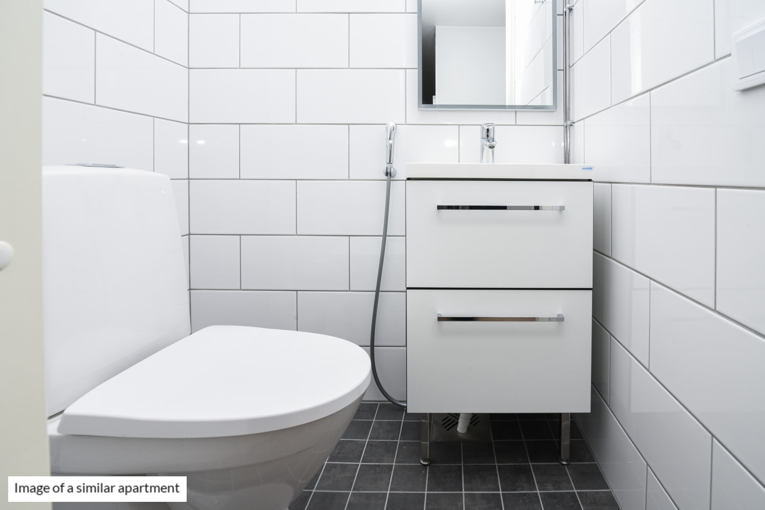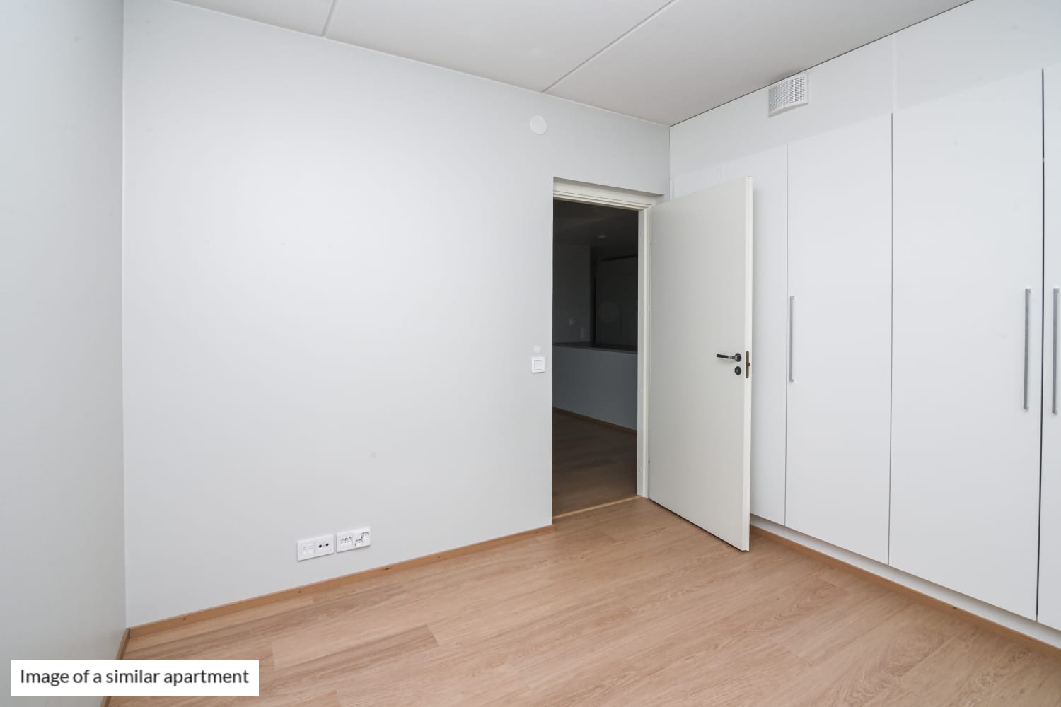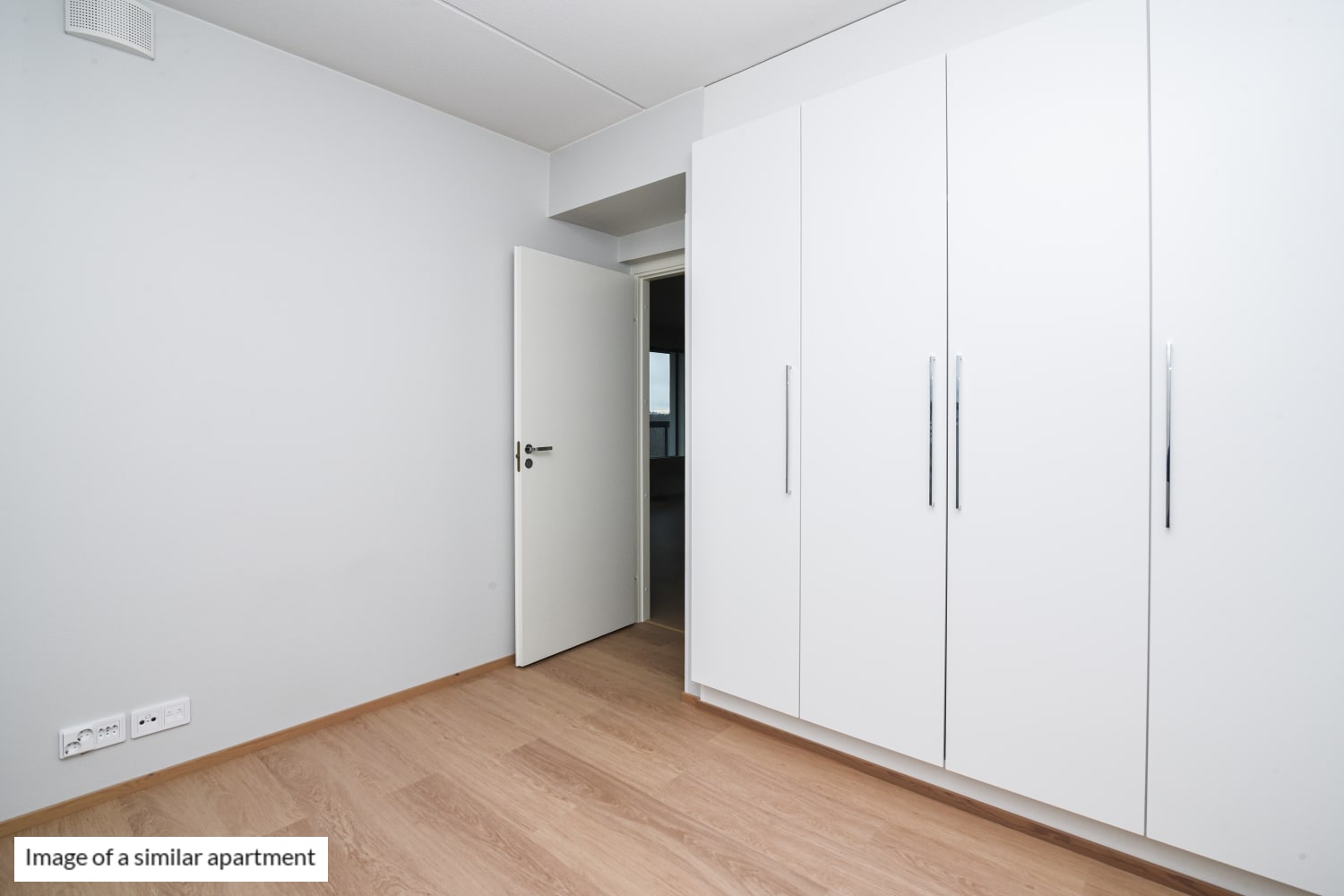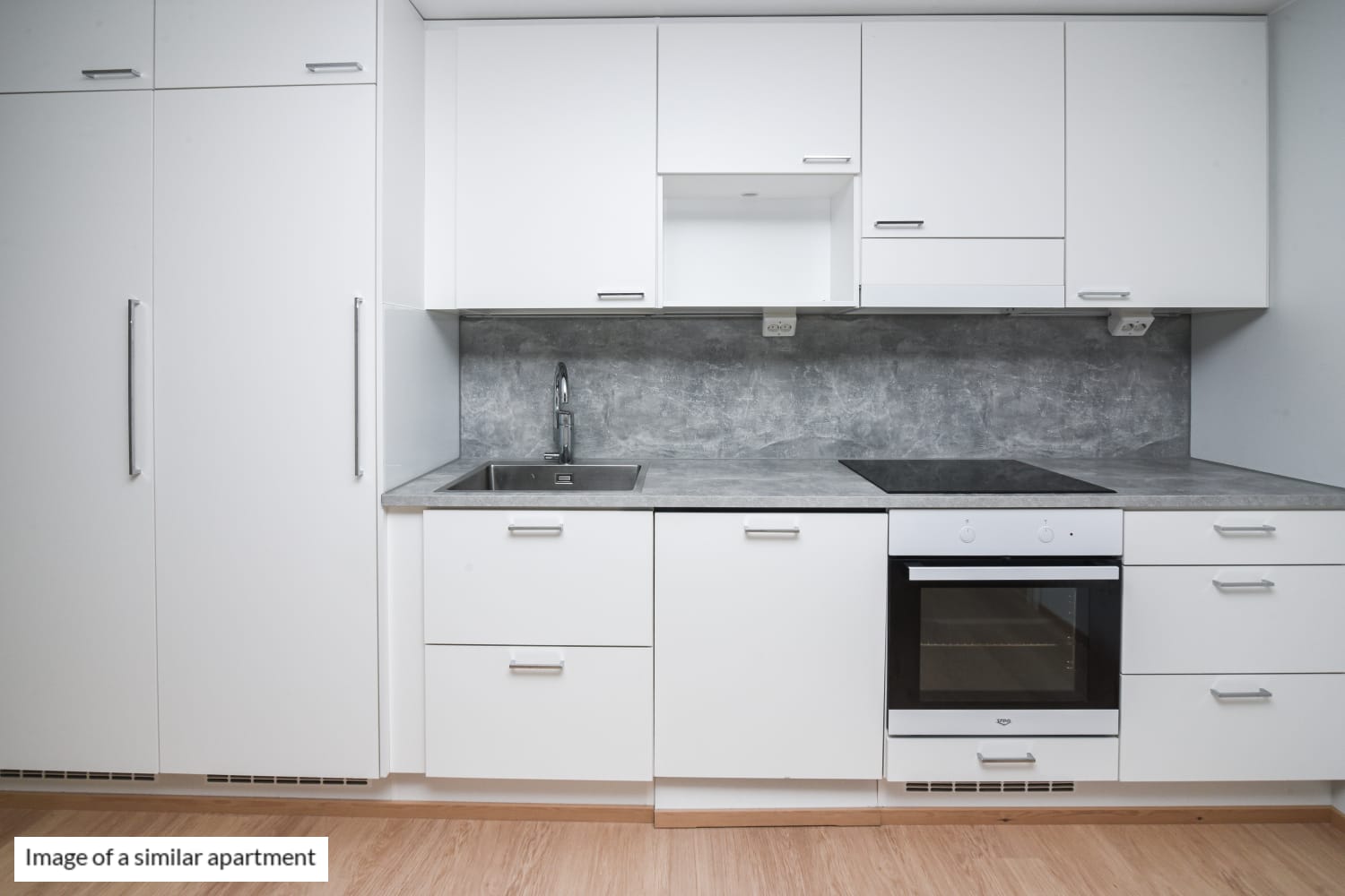 The interior materials and furnishings of the light-toned apartments are timeless and high-quality. The color world follows a calm Scandinavian style, which suits many tastes. The floors of the apartments are light oak laminate, and the walls are painted white. The entrance has either an open coat rack or a mirrored sliding door wardrobe. The cabinets in the bedrooms are white. The windows come with white Venetian blinds. All cabinets and closet furniture are domestic production of Kankarin Kaluste. The kitchen cabinet doors are white microlaminate. The space between the top and bottom cabinets and the worktop are grey laminate. The standard equipment includes a fridge-freezer in studio and 2br+kitchen apartments and a tall fridge and freezer, dishwasher, induction hob, separate oven, and cooker hood in 3br+kitchen apartments. The cold appliances and dishwashers are integrated into the kitchen furniture. The bathroom fixtures are from SATO's Kide collection, and their material is very durable and beautiful white solid laminate. The bathroom walls are white brick-laid tiling, and the floor tiling is grey. There is a space for a washing machine and tumble dryer.