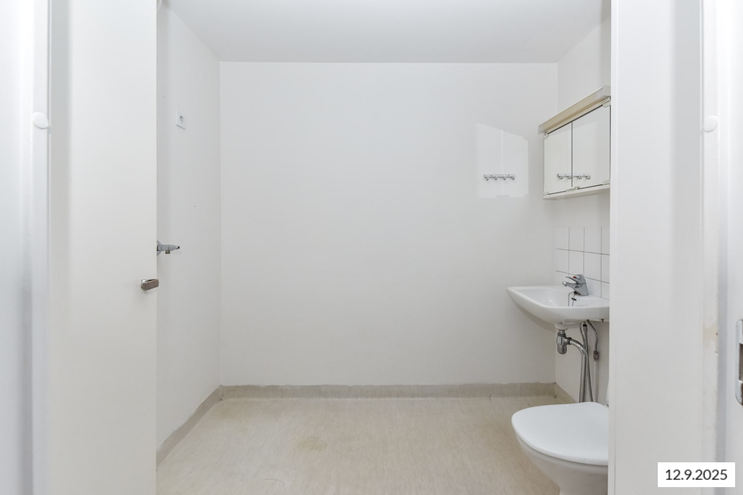 The floors in the living areas are laminate. The bathroom features a durable and practical concrete floor and tiled walls.