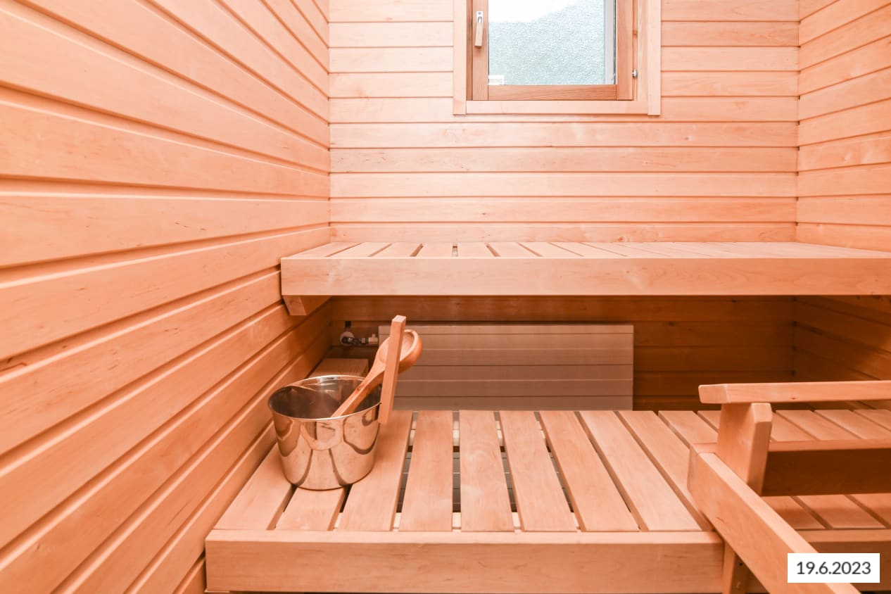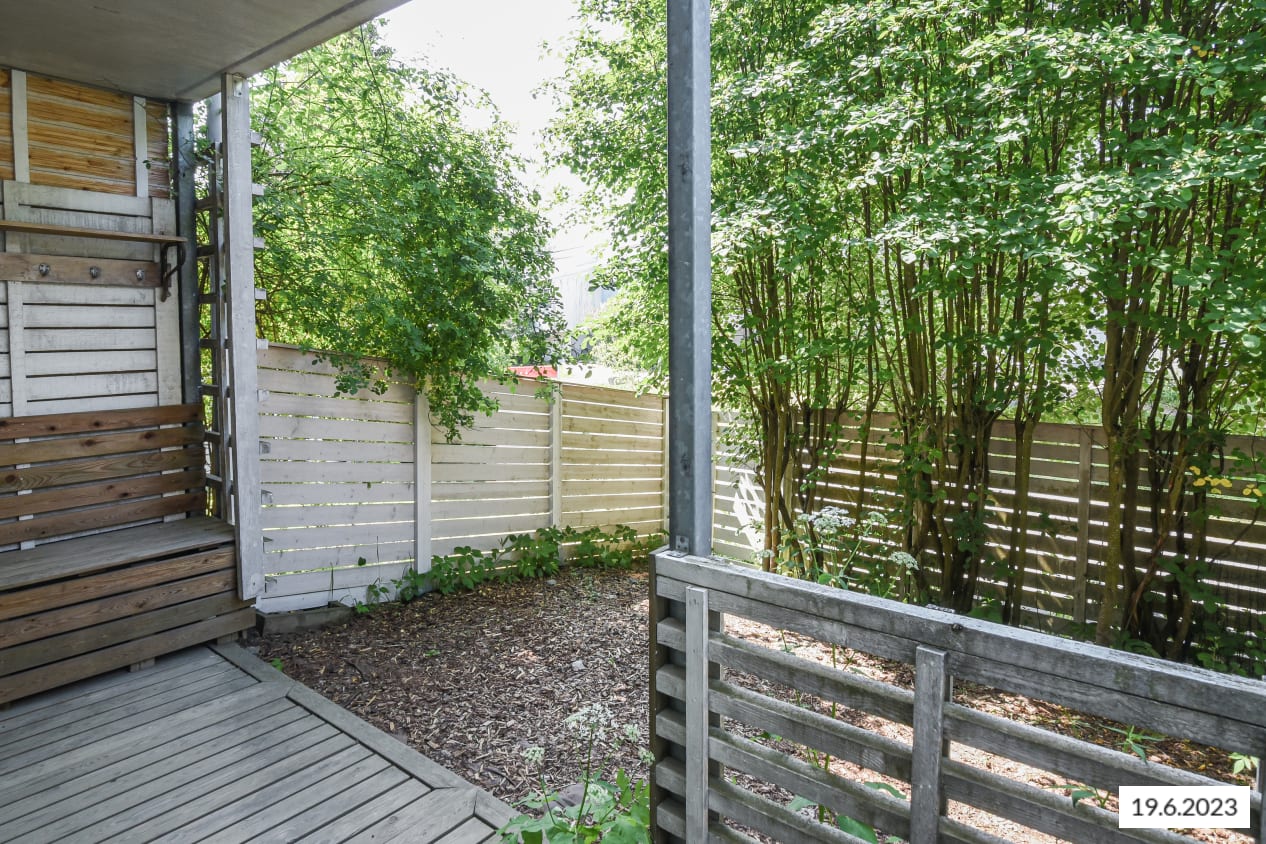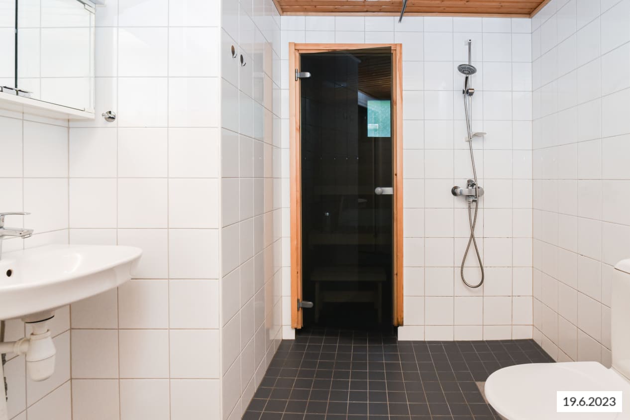 The spacious bathroom and private sauna with a window enhance the comfort of the home. After sauna, you can cool off on your own patio. The enclosed garden is also excellent for households with dogs.