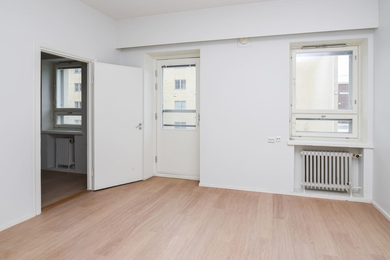 This charming one-bedroom home is located in a traditional setting opposite Paavalinpuisto. The living room features a convenient alcove corner, perfect for creating a space for remote work or relaxation. The kitchenette connects to the smaller room.