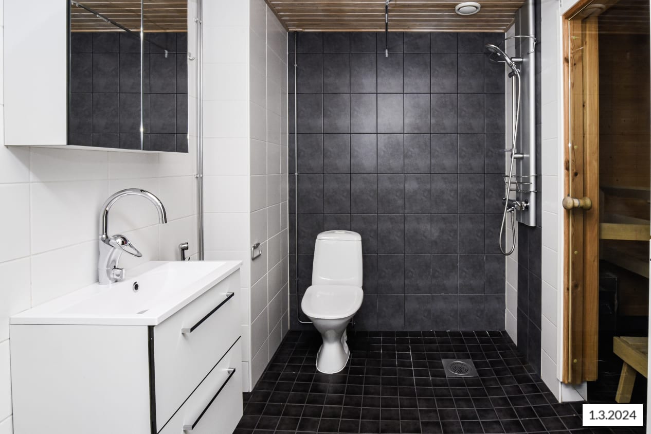 Living areas boast oak laminate flooring. The bathroom offers underfloor heating, soft grey tile flooring, and three white-tiled walls with one large tile in stylish graphite grey. There is space reserved for a washing machine. The hallway includes mirrored wardrobe doors. The home is crowned by its own sauna.