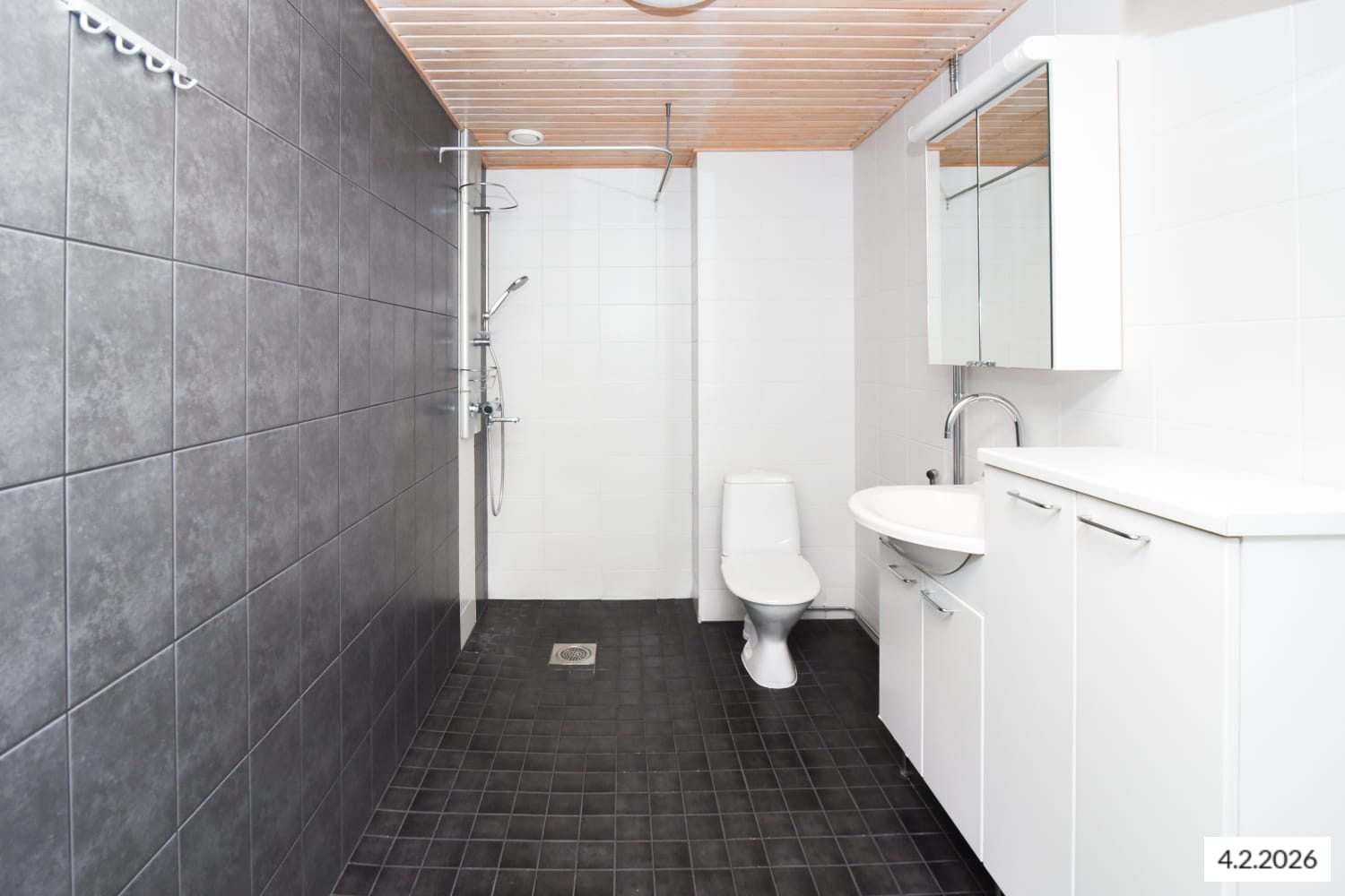 The bathroom offers comfort with underfloor heating, soft grey tiled flooring, and three walls tiled in white with one wall in stylish graphite grey large tiles. The hallway wardrobe has mirrored doors.