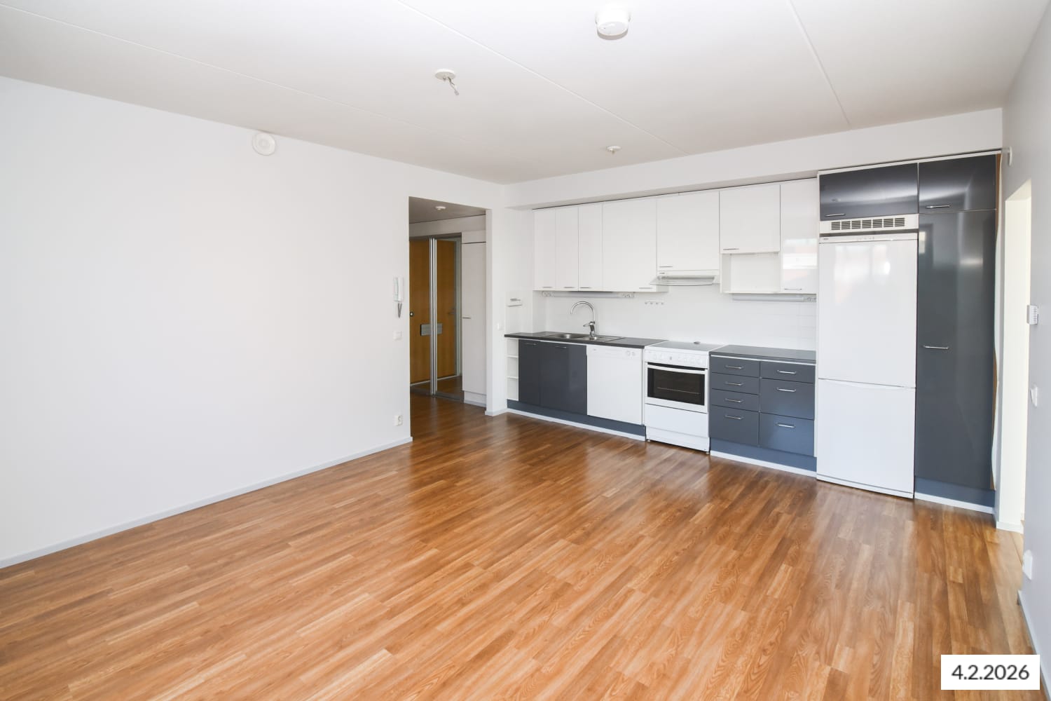 The living rooms feature oak laminate flooring. The kitchenette is completed with glossy grey lower cabinets, a dark grey laminate worktop, white tiled splashback, and glossy white upper cabinets. The freezer-refrigerator, ceramic stove, and dishwasher are white.