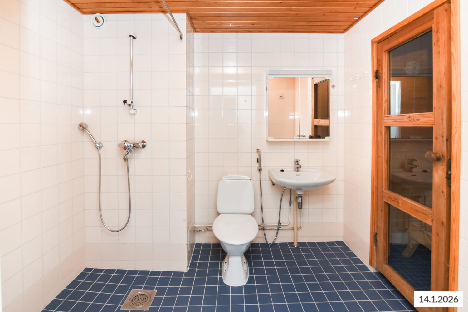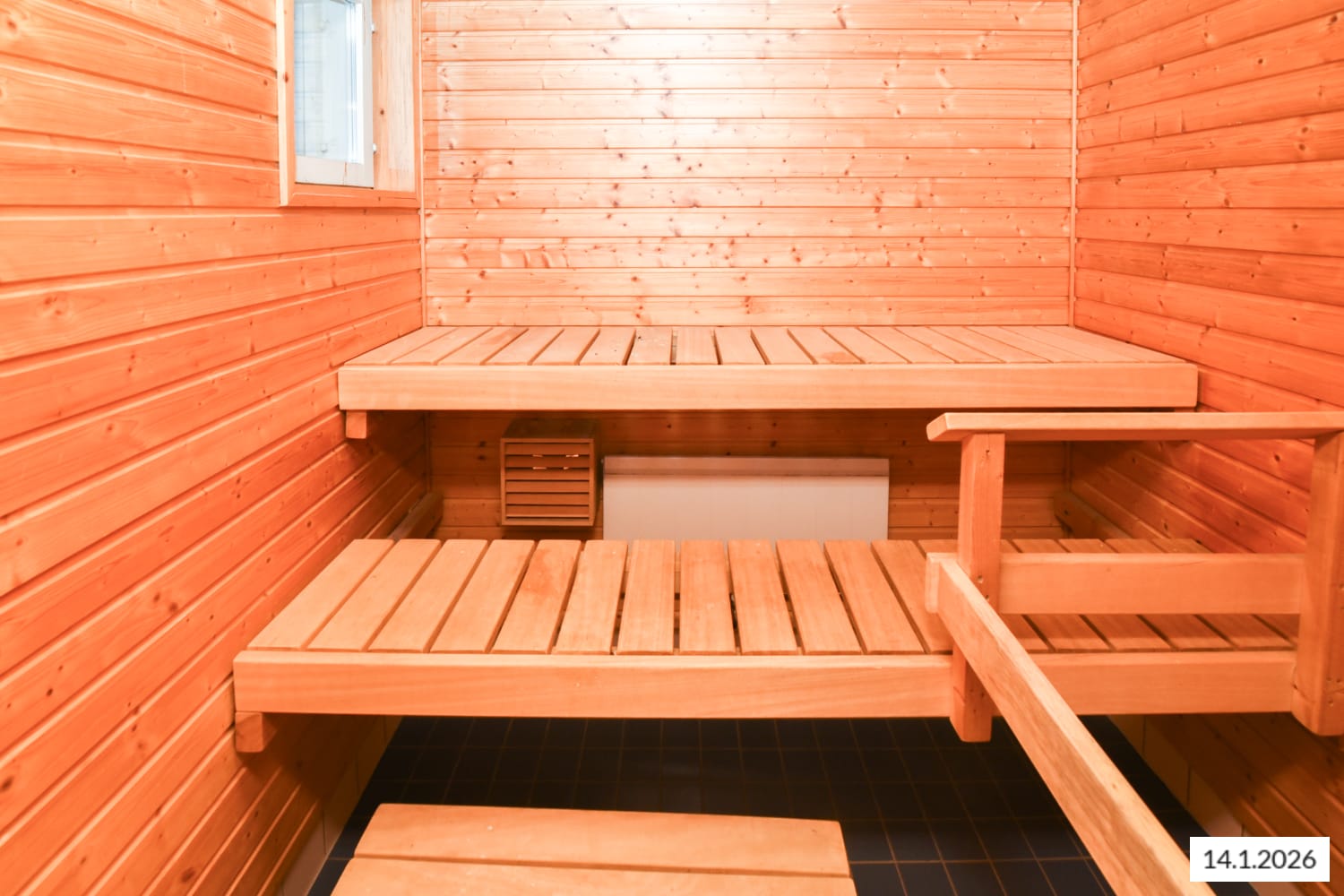 The bathroom is tiled. The private sauna offers the perfect place to relax and enjoy your own time.