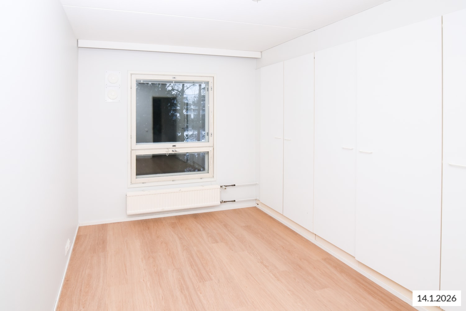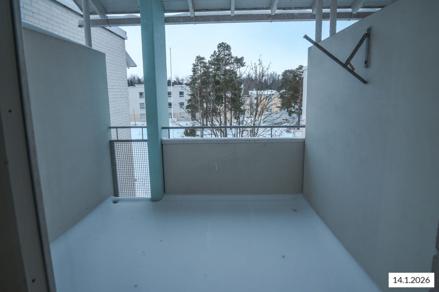 The two-bedroom home features a spacious balcony with views opening southwest to the courtyard. The home's layout is clear and functional. There is storage space both in the hallway and in both bedrooms. The living areas have warm-toned floors.