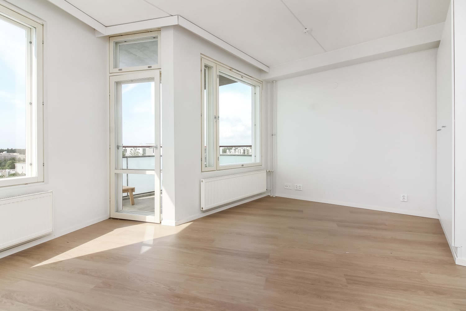 This spacious studio with light-toned finishes and a unique layout is easy to personalize into your dream home thanks to its neutral surfaces. The flooring is oak-colored laminate, and the walls are painted in a fresh white.