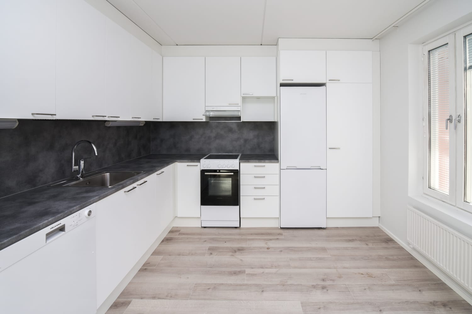 The open kitchen offers ample space for cooking and hosting evening gatherings, with a reserved space for your dishwasher. The home provides plenty of storage space, with a walk-in wardrobe connected to the largest bedroom. A separate, second small WC complements the bathroom, enhancing everyday convenience.