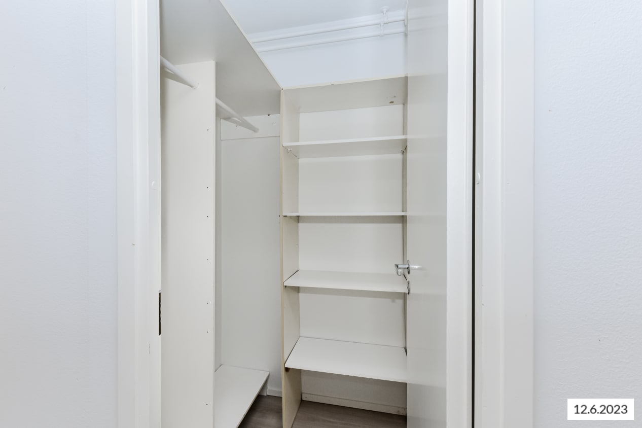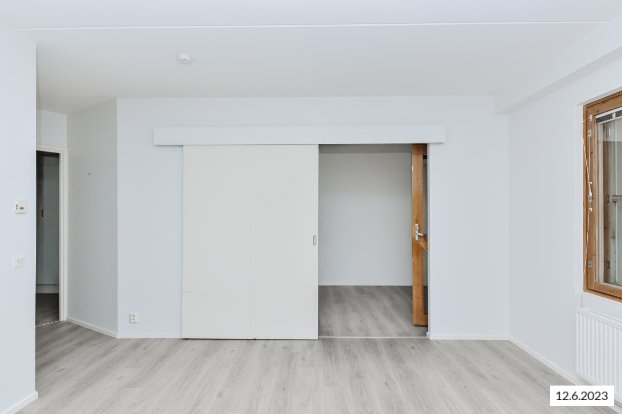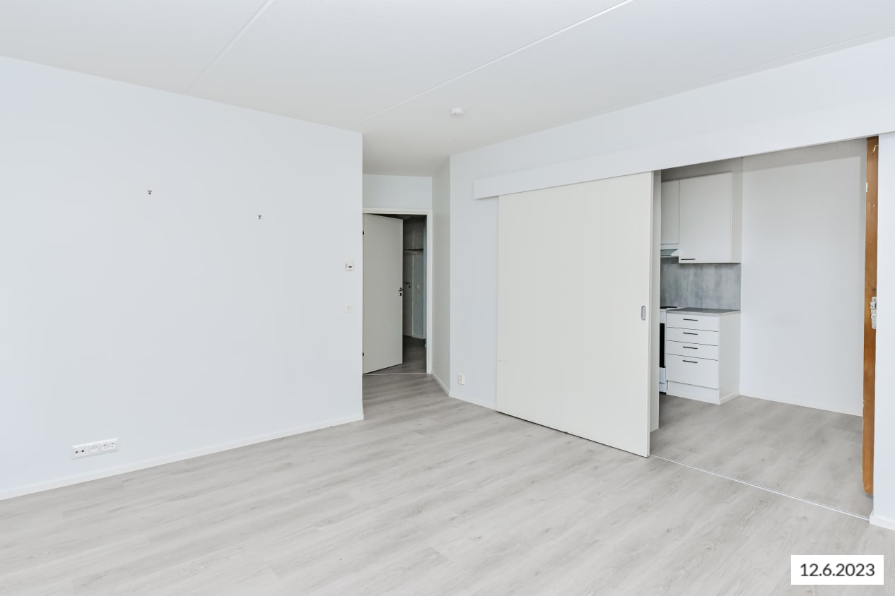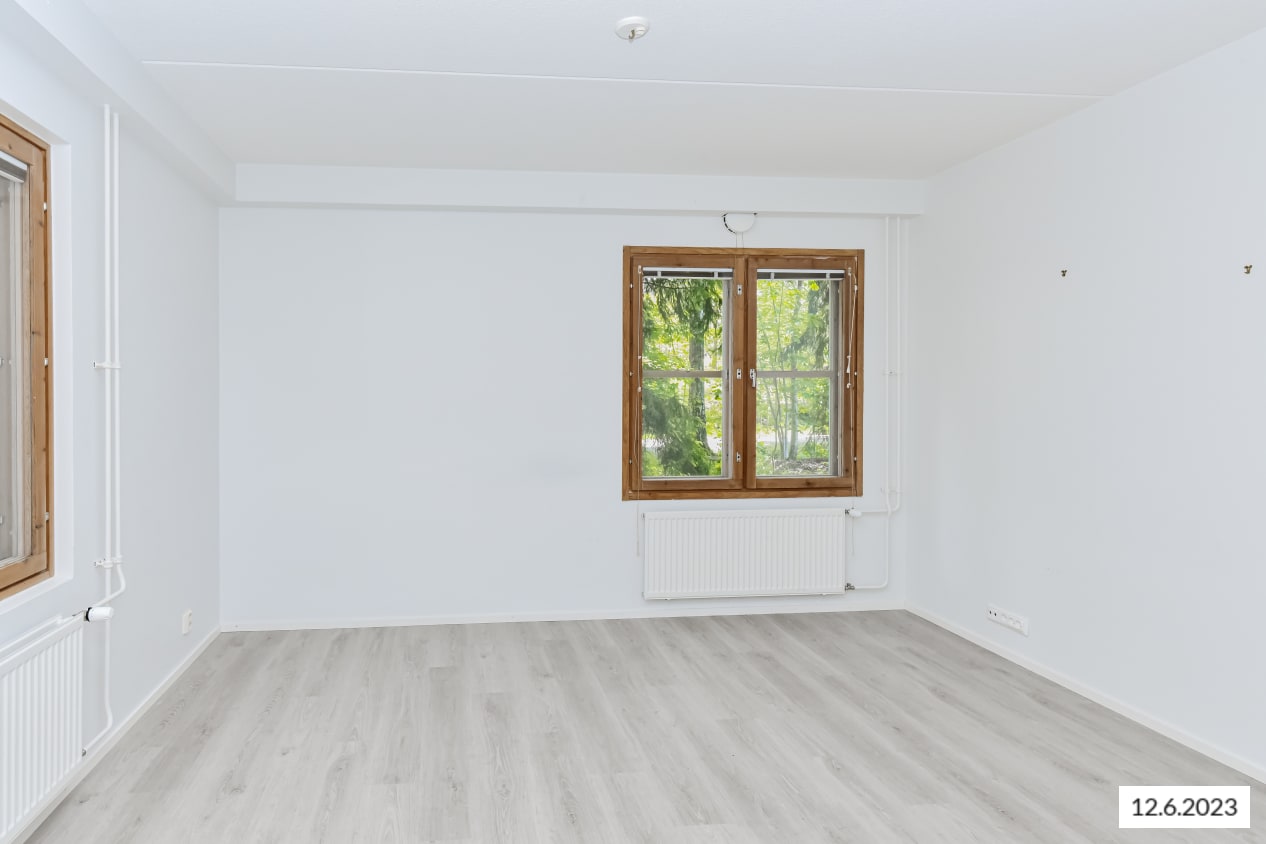 A cosy home near expansive parks and versatile outdoor trails is ready to welcome new residents. Located on the western edge of the lush Pohjavedenpuisto park, this inviting apartment features a sheltered balcony and a bathroom with space for a washing machine. The floors are oak-effect laminate, and the walls are painted a fresh white. As a corner unit, the apartment is wonderfully bright and offers green views of the yard.