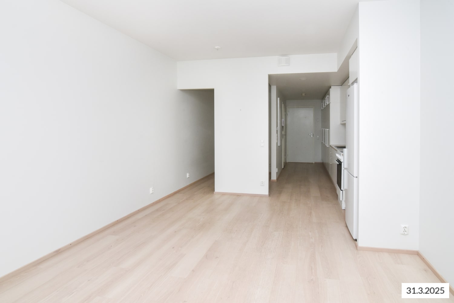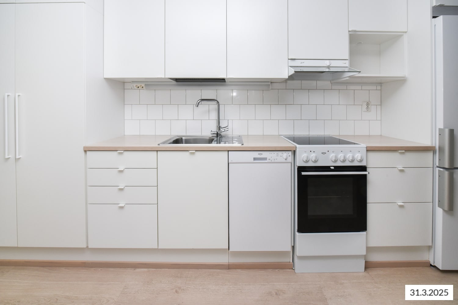 The floors in the living areas are cosy oak laminate. The walls and cupboard units are white. In the kitchen, the cabinet doors are white, and the area between the upper and lower cabinets is tiled in white. The worktop is oak laminate, matching the floor. The equipment includes a ceramic stove, dishwasher, and freezer-refrigerator. In the bathroom, the walls are white and the floors are a subtle grey tile. Water-circulated underfloor heating provides comfort for your feet. There is a provision for a washing machine and tumble dryer.