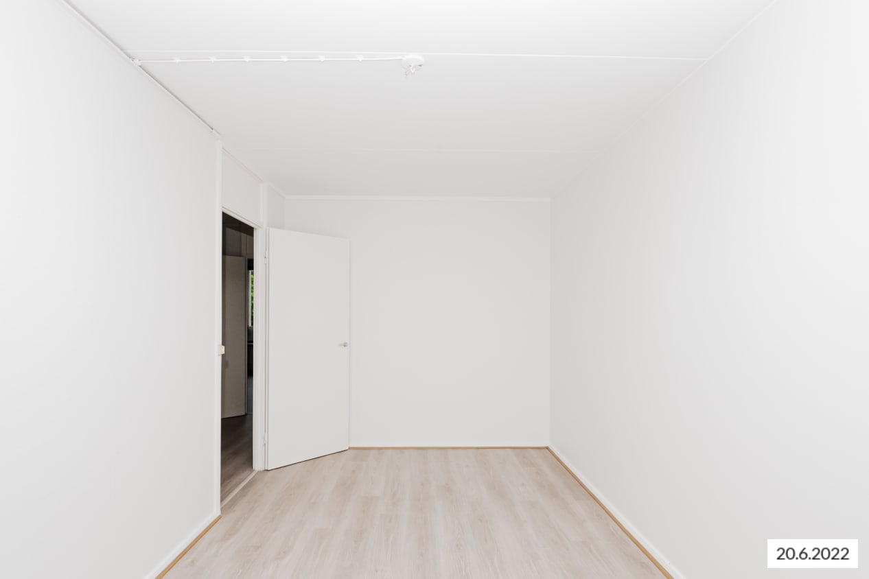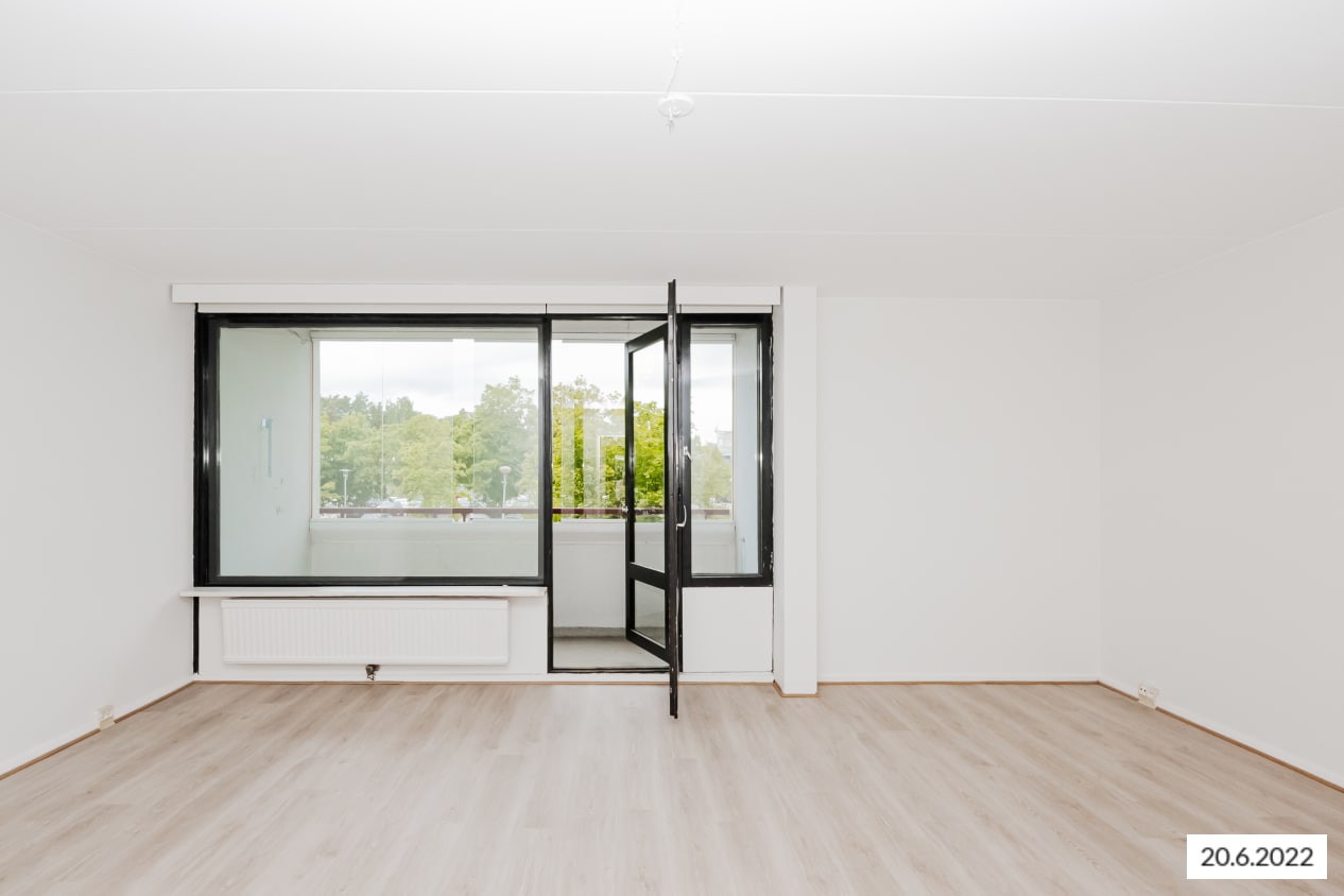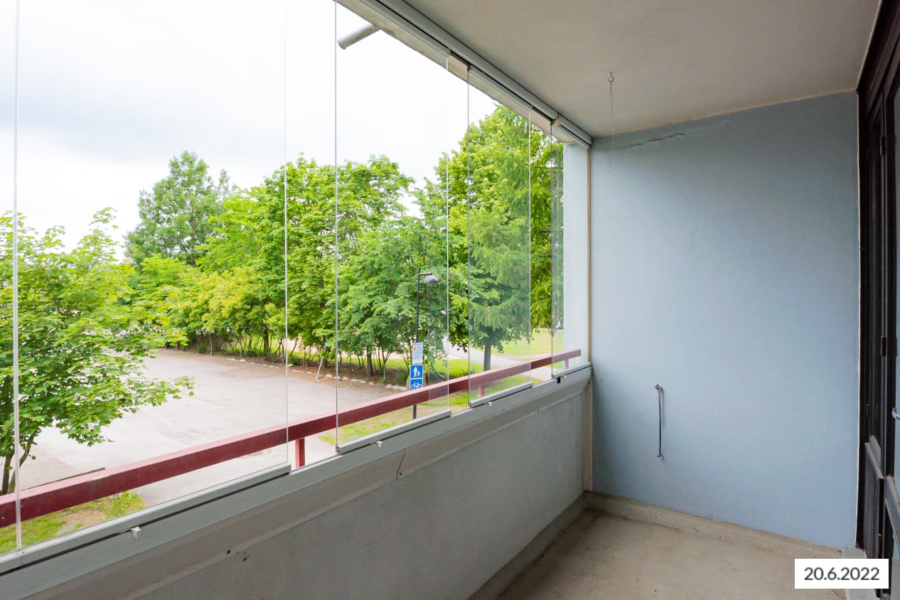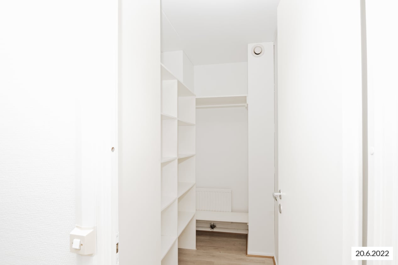 This through-apartment one-bedroom charms with its spaciousness and neat surfaces. This bright home has a separate bedroom, kitchen, and living room, which opens onto a glazed balcony. A walk-in closet ensures you won't run out of storage space. The kitchen comfortably accommodates a dining table by the window. The floors are oak laminate, and the black details of the balcony window provide a striking contrast to the light surfaces. The glazed balcony can be enjoyed from spring well into autumn.