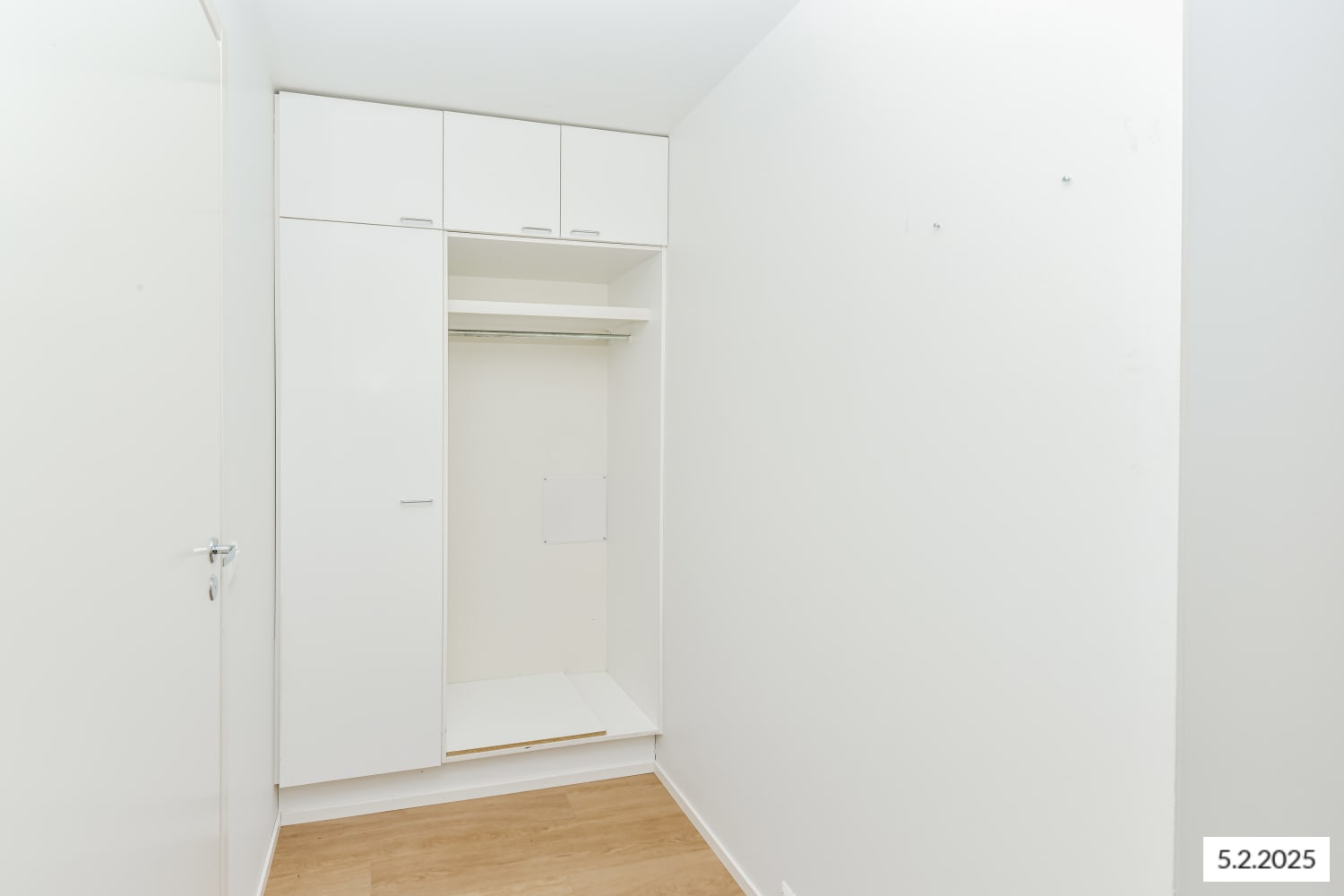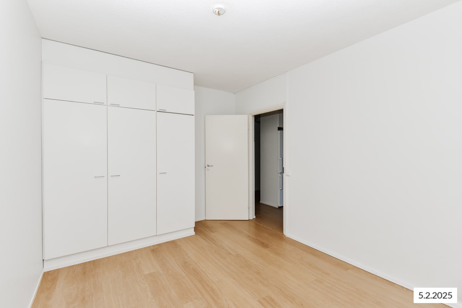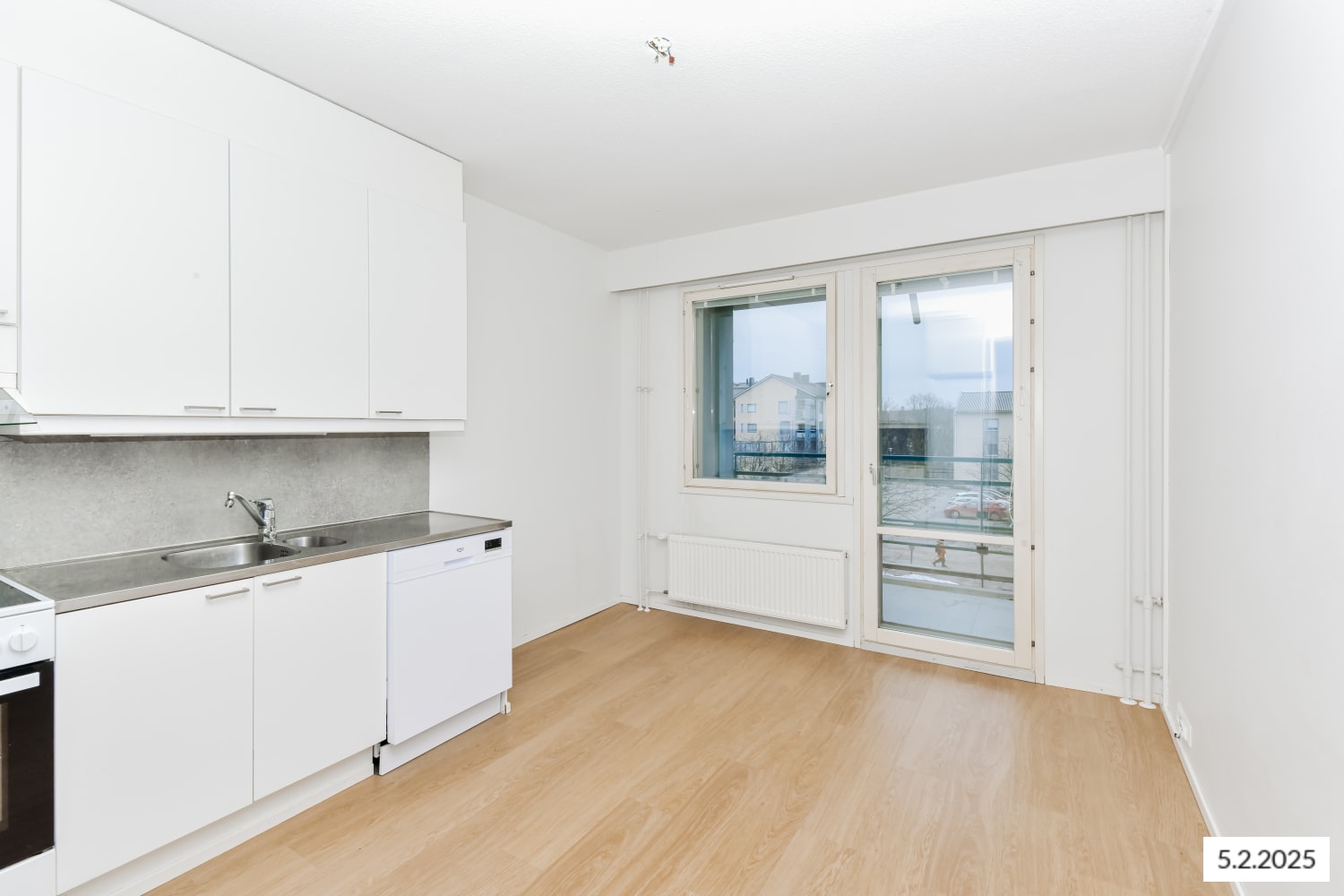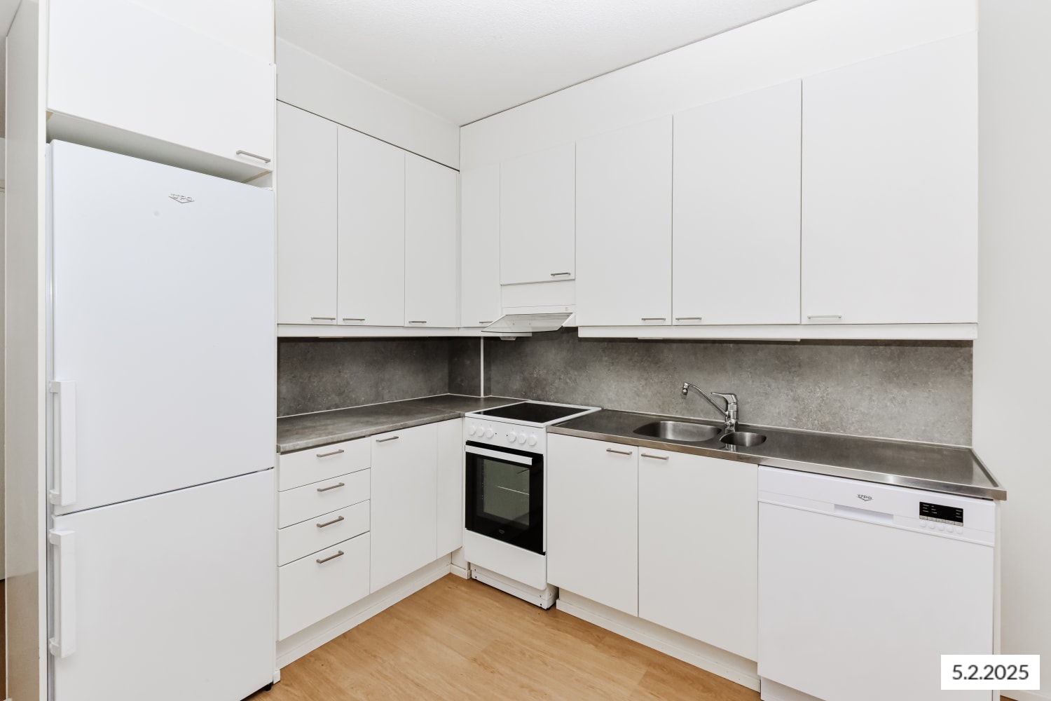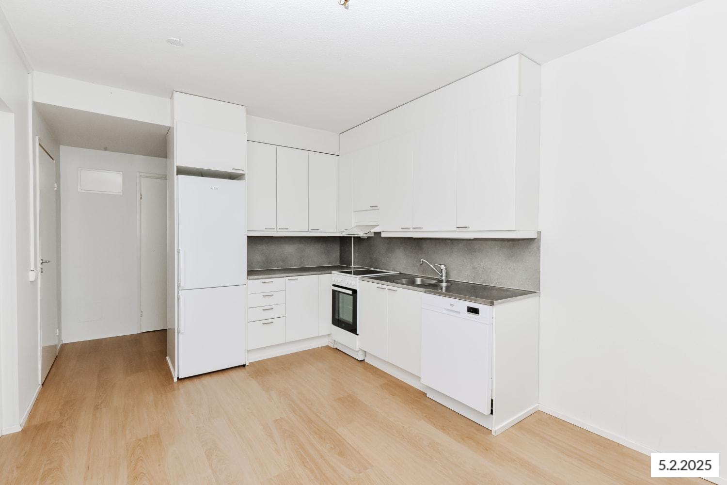 The apartment features wood-coloured laminate floors and walls painted in harmonious white. The kitchen is equipped with a freezer-refrigerator, ceramic hob and extractor hood, dishwasher, and freezer-refrigerator.