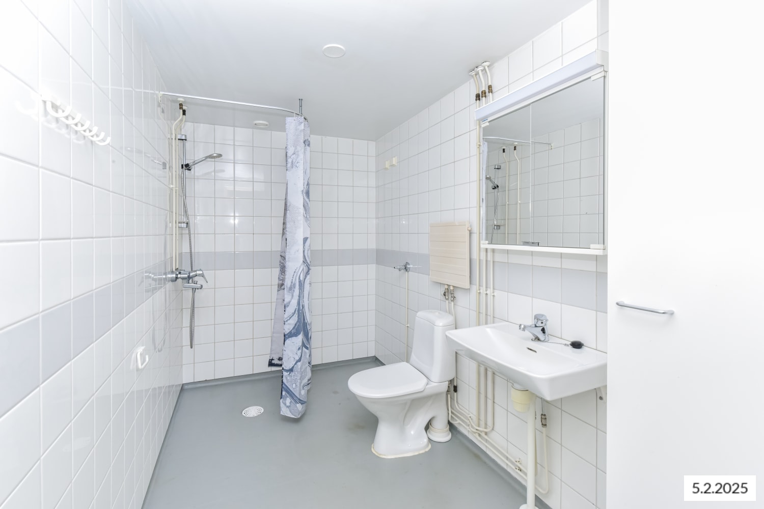 The bathroom has space reserved for a washing machine.