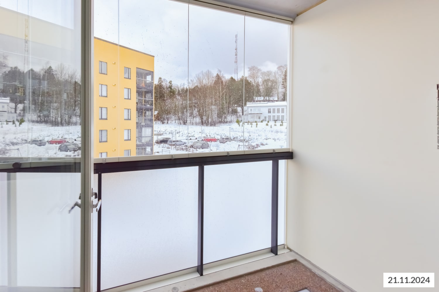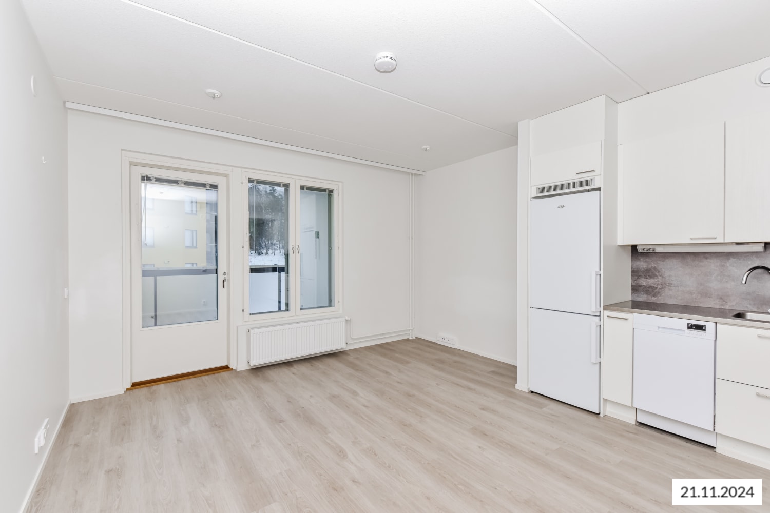 In this brand new studio apartment, completed in spring 2022, the kitchen and living room form a functional and modern space that can be easily furnished to your liking. The generously sized glazed balcony faces the morning sun. The home features light-colored materials that suit many tastes. The flooring is oak laminate, and the walls are painted white. The sleek open kitchen has white, wood-grain cabinets. The space between the upper and lower cabinets is gray laminate. The kitchen is equipped with a ceramic cooktop, a built-in oven, a fridge-freezer, and a dishwasher. The appliances are white. The bathroom has white fixtures from SATO's Kide collection and a space for a washing machine. The walls are tiled in white, and the floor is gray.