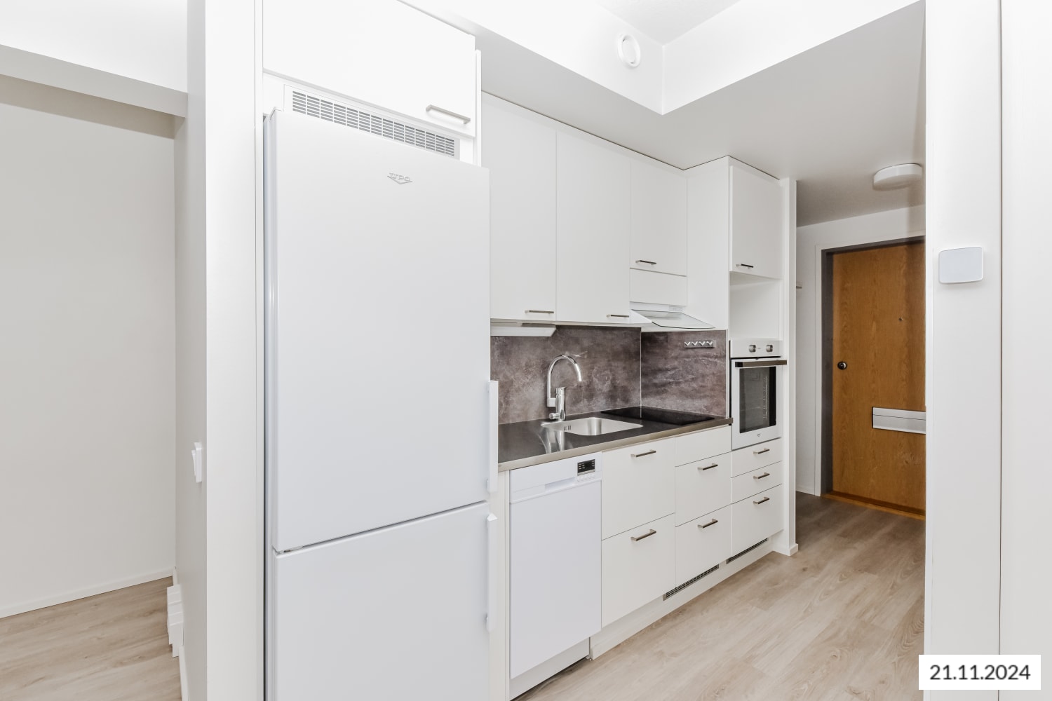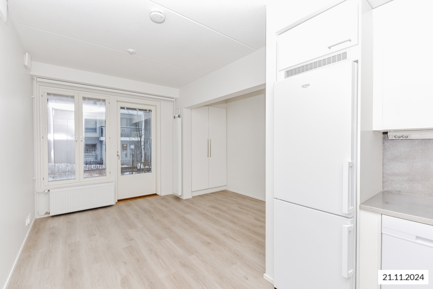 Completed in spring 2022, this fresh studio apartment is clear and timelessly beautiful. The kitchen and living room combine into an open living space that extends to a covered yard area. Along one wall of the apartment is a nook suitable for resting, complete with a wardrobe. Enjoy summer evenings on your own patio.