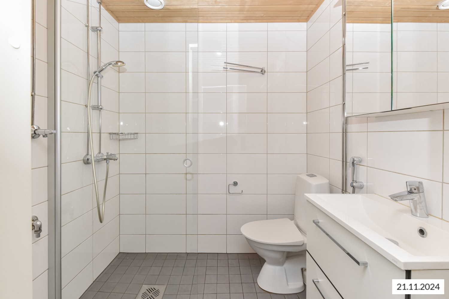 The home’s surface materials are light and suit many tastes. The flooring is oak laminate, and the walls are painted white. The streamlined open-plan kitchen features white cabinets with a wood grain pattern. The space between the upper and lower cabinets is grey laminate. The equipment includes a ceramic hob, built-in oven, freezer-refrigerator, and dishwasher. All appliances are white.