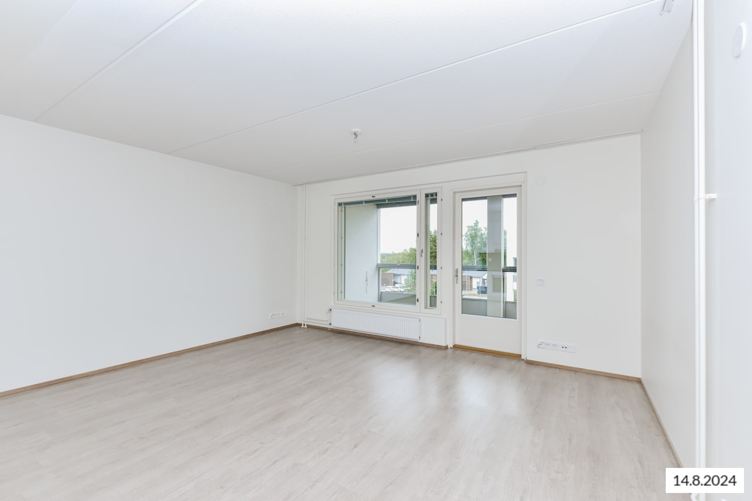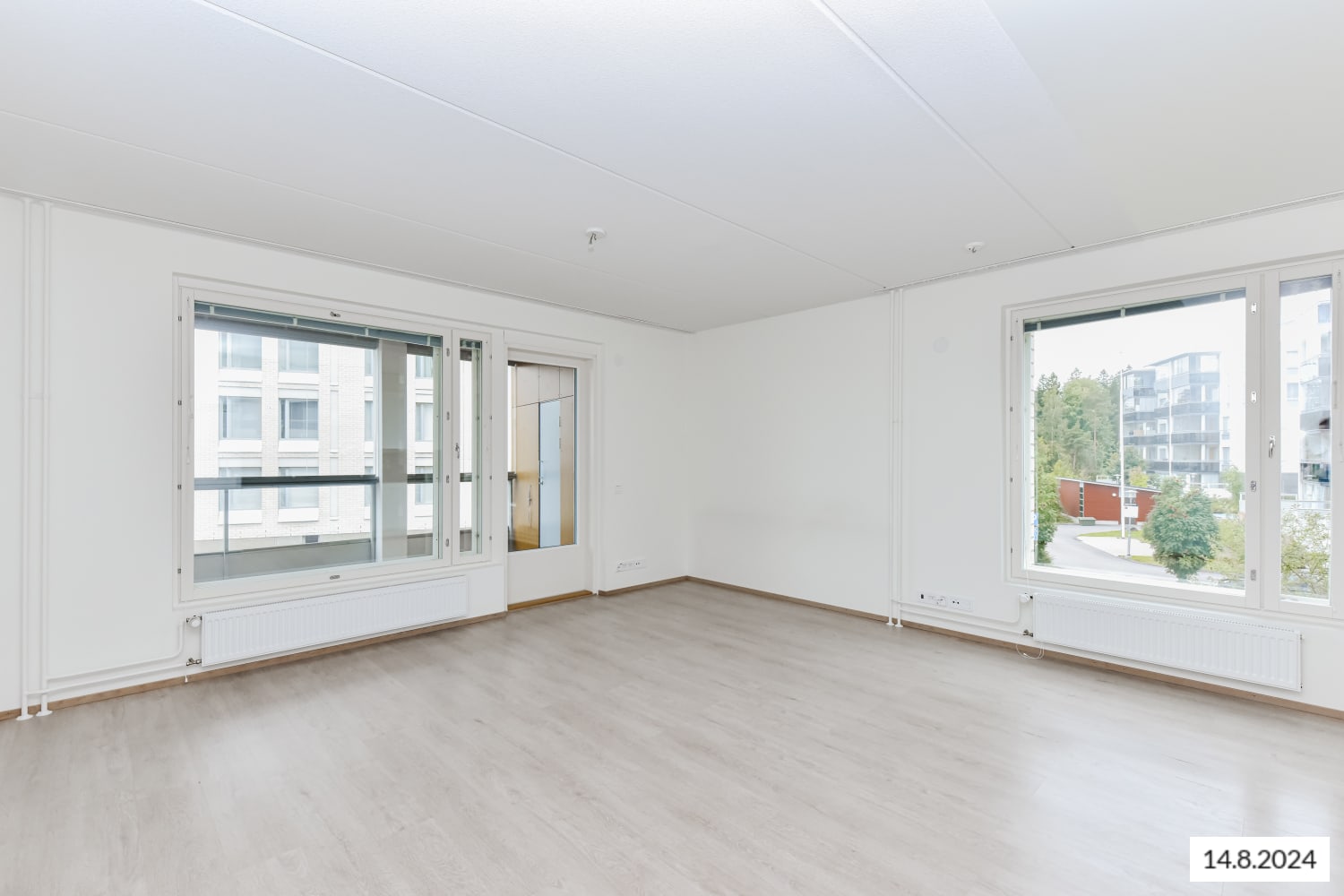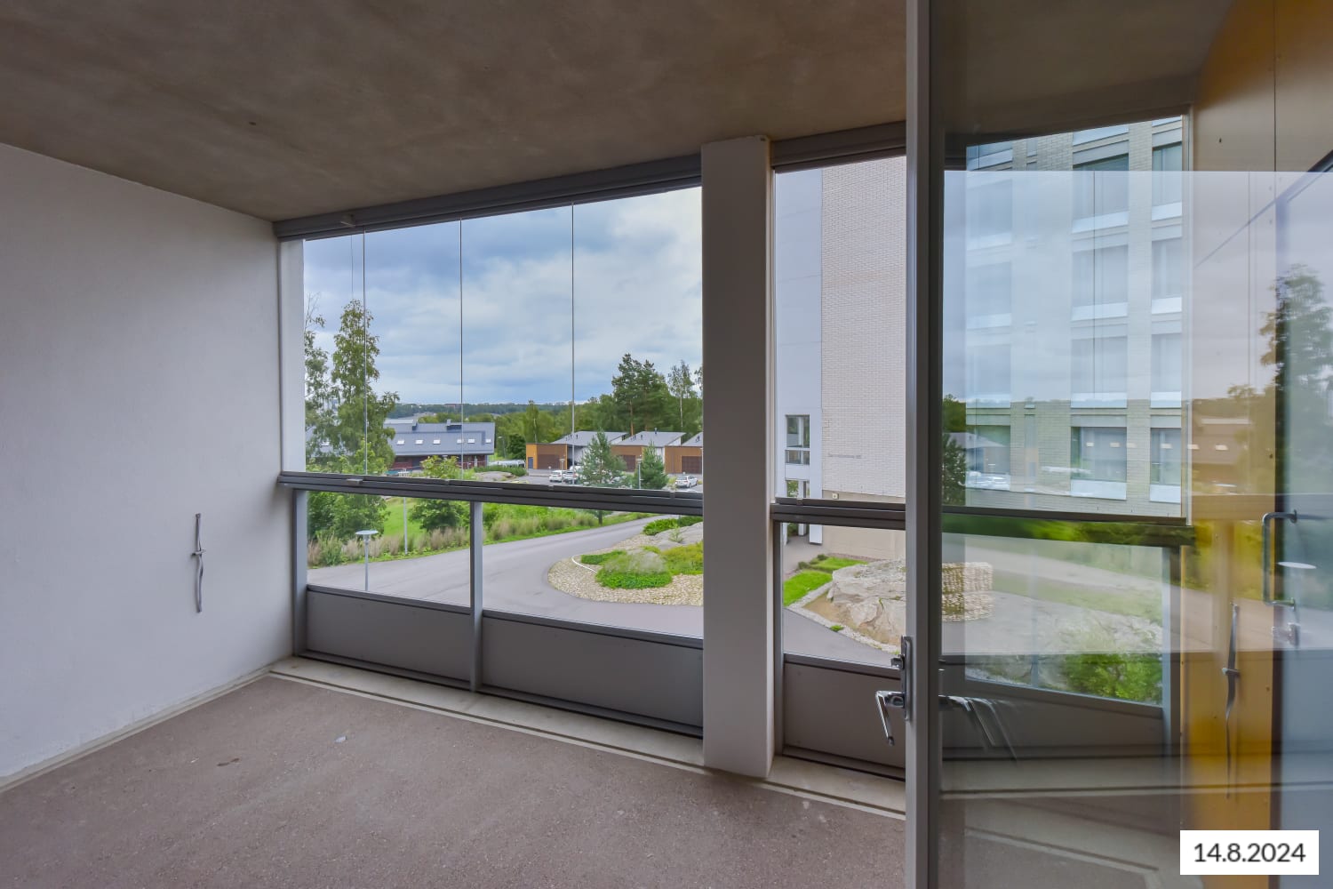 The heart of this beautiful one-bedroom home is the bright living area created by the kitchen and living room, with windows opening in two directions. The dining table fits cosily beneath the window. The living room provides access to the sunny glazed balcony.