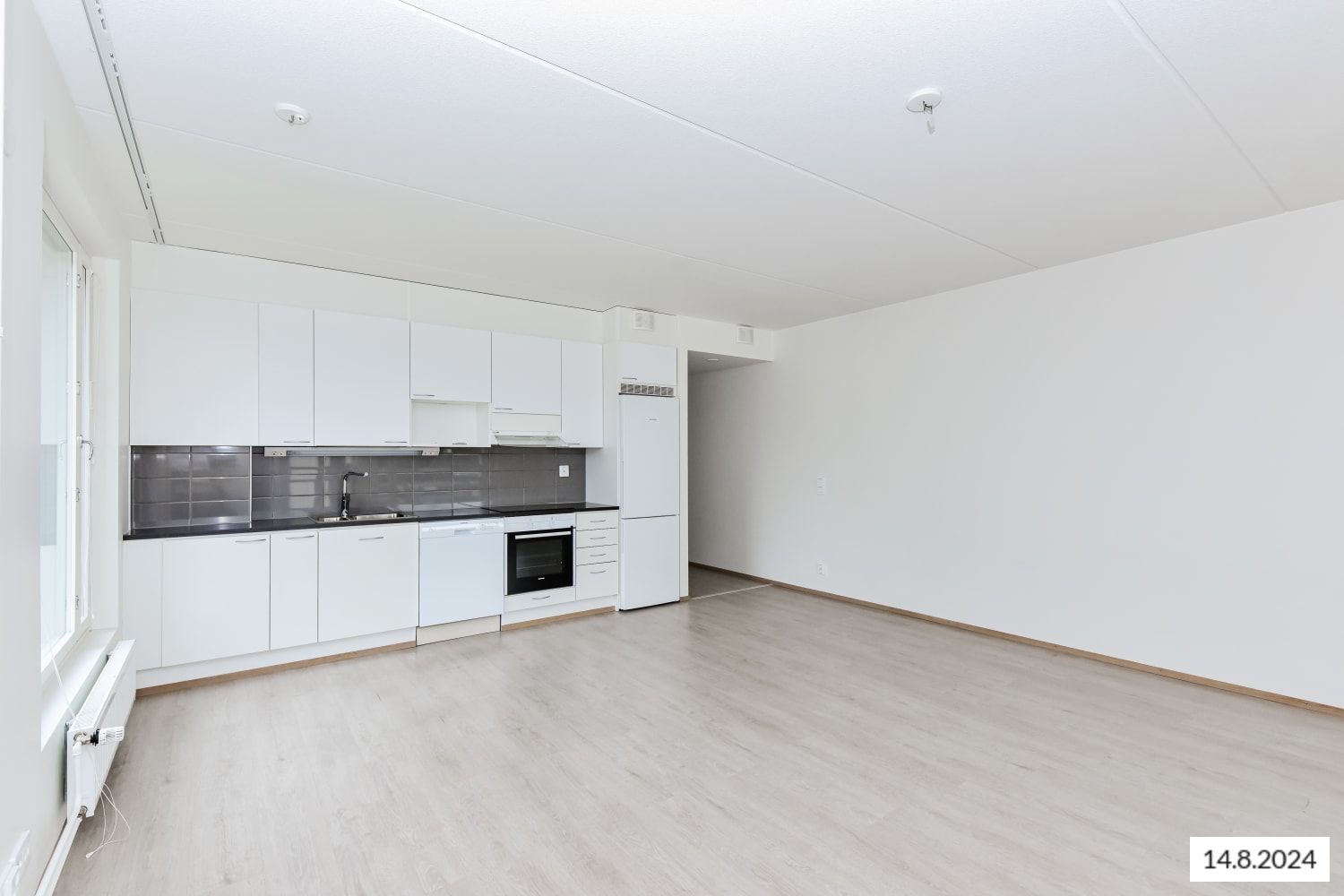 The floors in this light-coloured home are laminated to resemble light oak. The kitchen cabinet doors are crisp white, and the space between them is tiled with grey tiles. The laminated worktop has a dark wood tone. The equipment includes a ceramic hob, built-in oven, dishwasher, and freezer-refrigerator. The appliances are white.