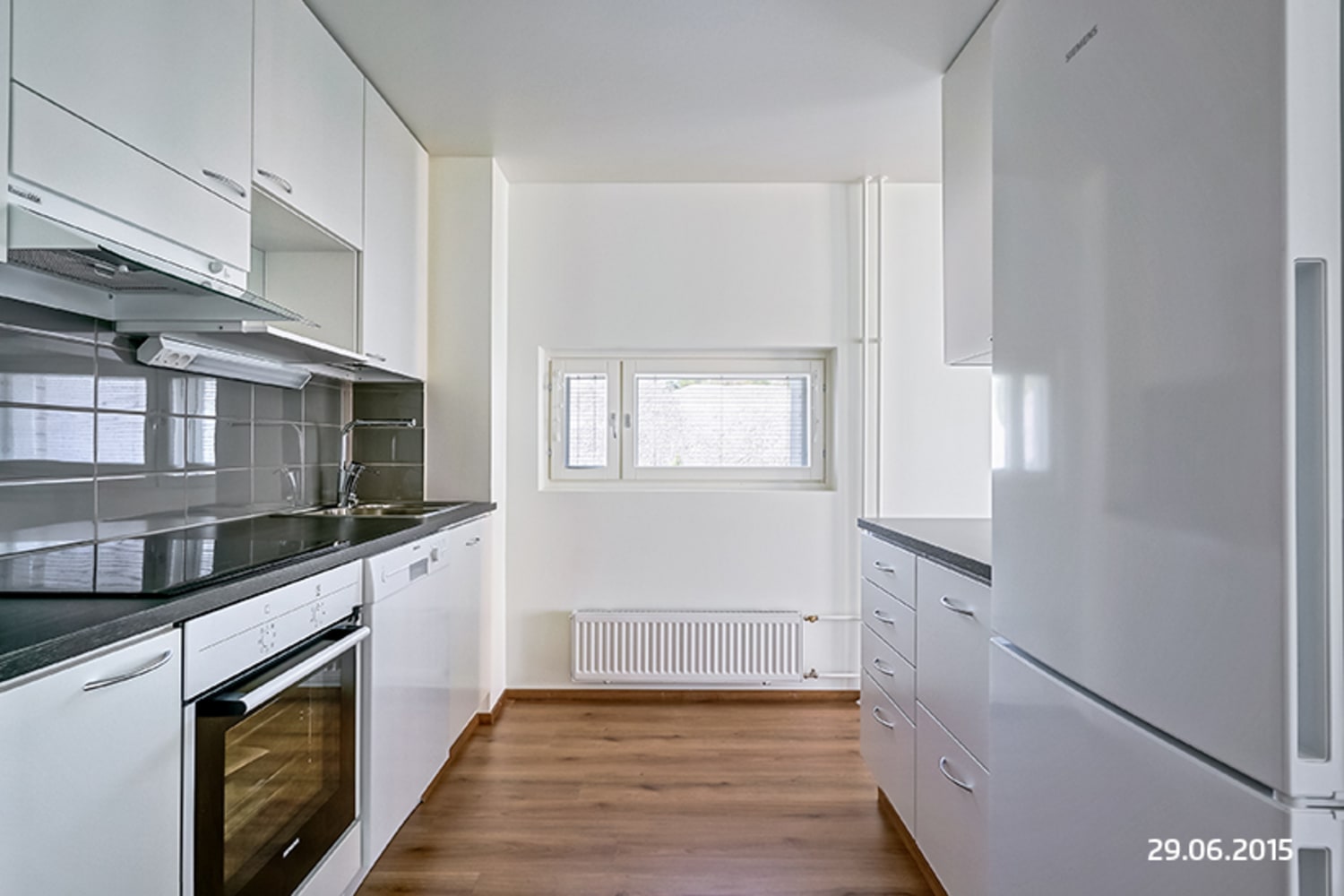 The floors of this light-toned home are stylish laminate that mimics oak. The kitchen cabinets have fresh white doors, and the space between the cabinets is tiled with gray tiles. The laminate countertops have a dark wood tone. The equipment includes a ceramic cooktop, a built-in oven, a dishwasher, and cold appliances. The home appliances are white. The bathroom walls are tiled with glossy white tiles, with an accent wall tiled in dark gray for contrast. The floors are also dark gray. The bathroom cabinets are white, and there is space reserved for a washing machine and a dryer.