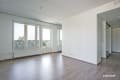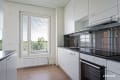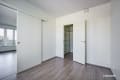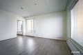 The light-toned home boasts floors in beautiful laminate that mimics light oak. Kitchen cupboard doors are a fresh white, and the space between the cabinets is tiled with grey tiles. The laminate worktop has a dark wood tone. The kitchen is equipped with a ceramic hob, built-in oven, dishwasher, and freezer-refrigerator. The appliances are white.
