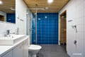 The bathroom walls are tiled with glossy white tiles, accented by a sea-blue feature wall. The floors are dark grey, and the bathroom cabinets are white. There is space allocated for a washing machine and tumble dryer.