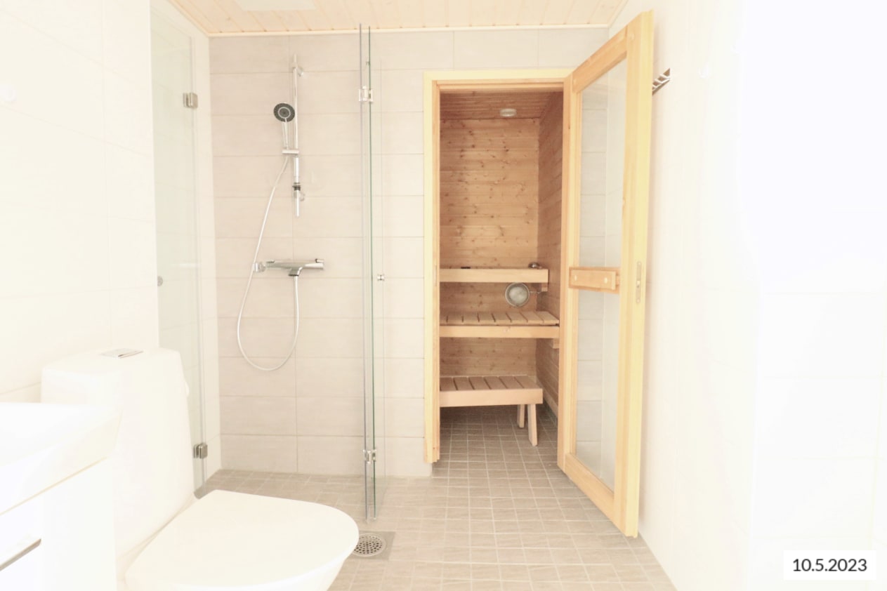In the bathroom, you can unwind in your own sauna whenever it suits you best. There is also space for a washing machine.