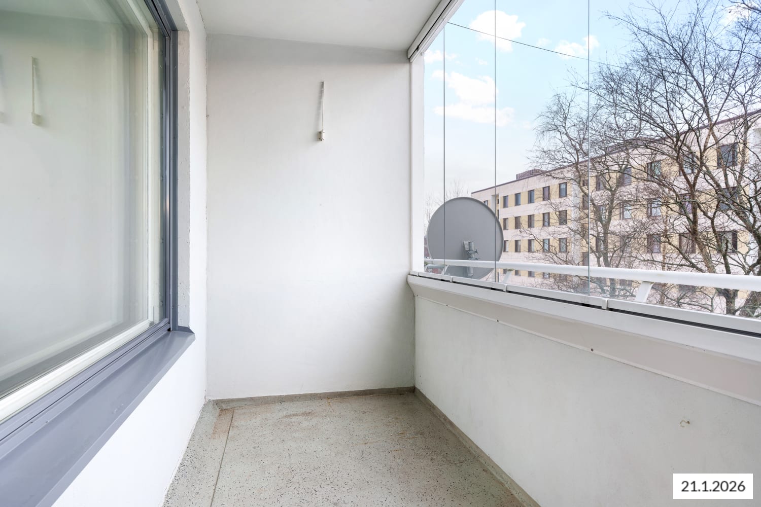 The glazed balcony of this 1-bedroom home situated in a peaceful environment offers a lush view, perfect for enjoying throughout the changing seasons.