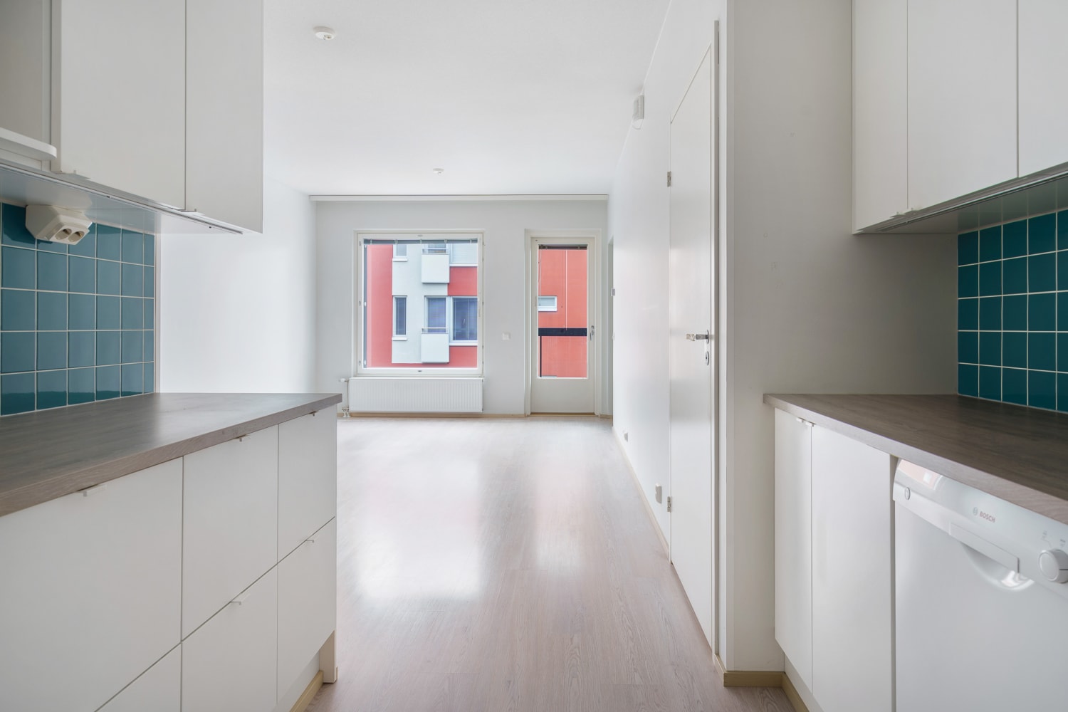 The flooring in the living areas is laminate resembling bleached oak planks. The walls and closet fixtures are white. In the kitchen, the cabinet doors are white, and the space between the upper and lower cabinets is tiled in petrol blue. The worktop complements the floor with a light oak-toned laminate. The kitchen is equipped with a ceramic hob, dishwasher, and freezer-refrigerator.