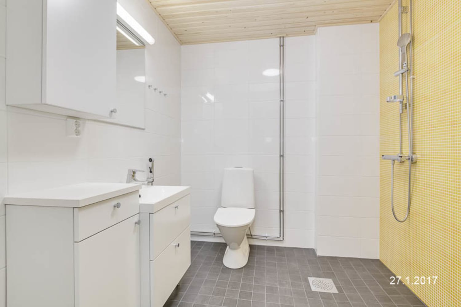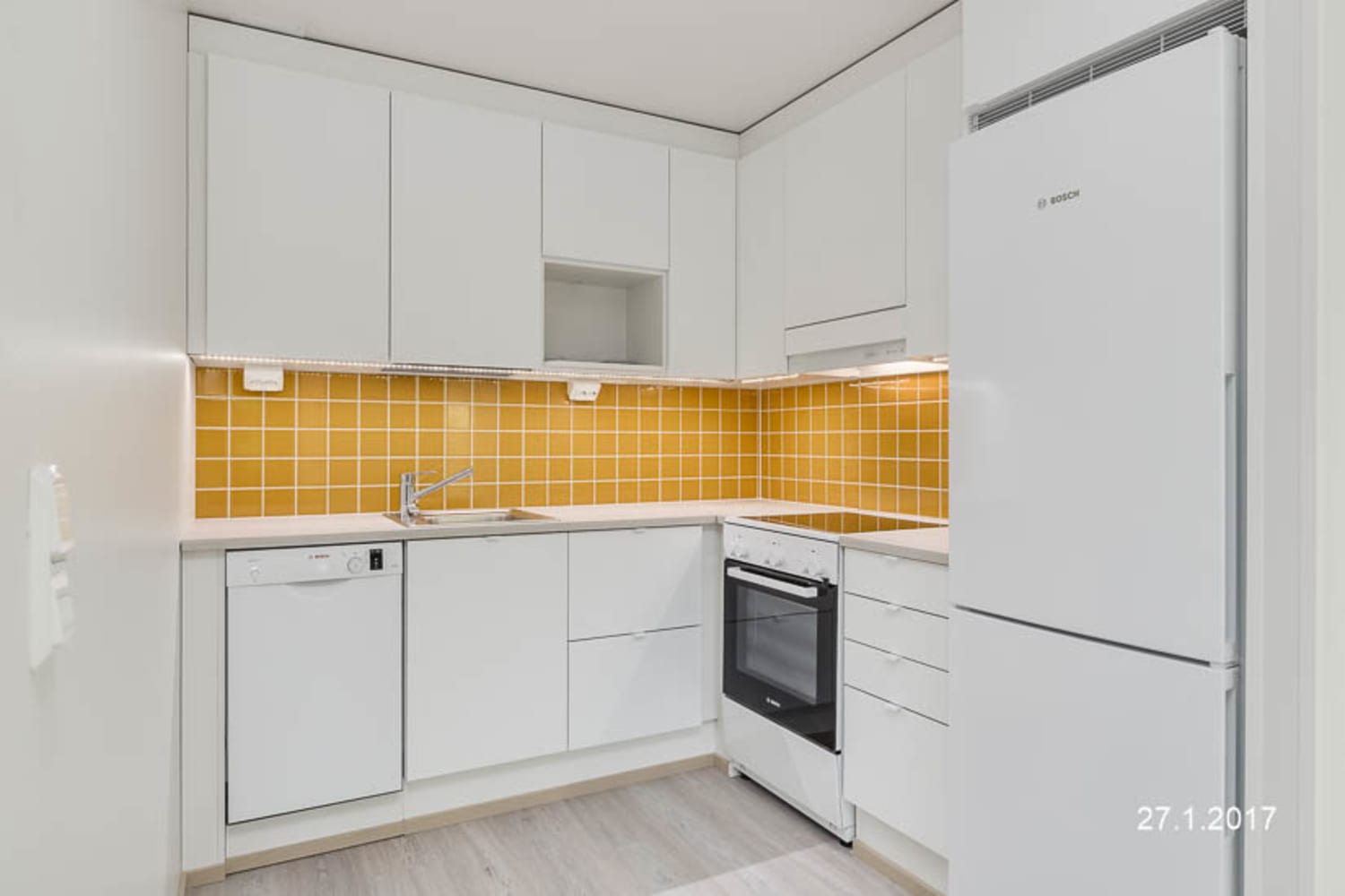 The floors in the living areas are laminate, resembling bleached oak planks. The walls and cabinetry are white. In the kitchen, the cabinet doors are white, and the space between the upper and lower cabinets is tiled in a spicy yellow. The countertop is gray oak laminate. The kitchen is equipped with a ceramic stove, dishwasher, and fridge-freezer. The bathroom walls are mostly white tiles, and the floors are gray tiles. The harmonious color scheme is enlivened by a yellow mosaic tile accent wall. There is space for a washing machine and dryer.