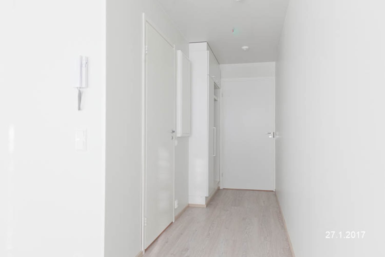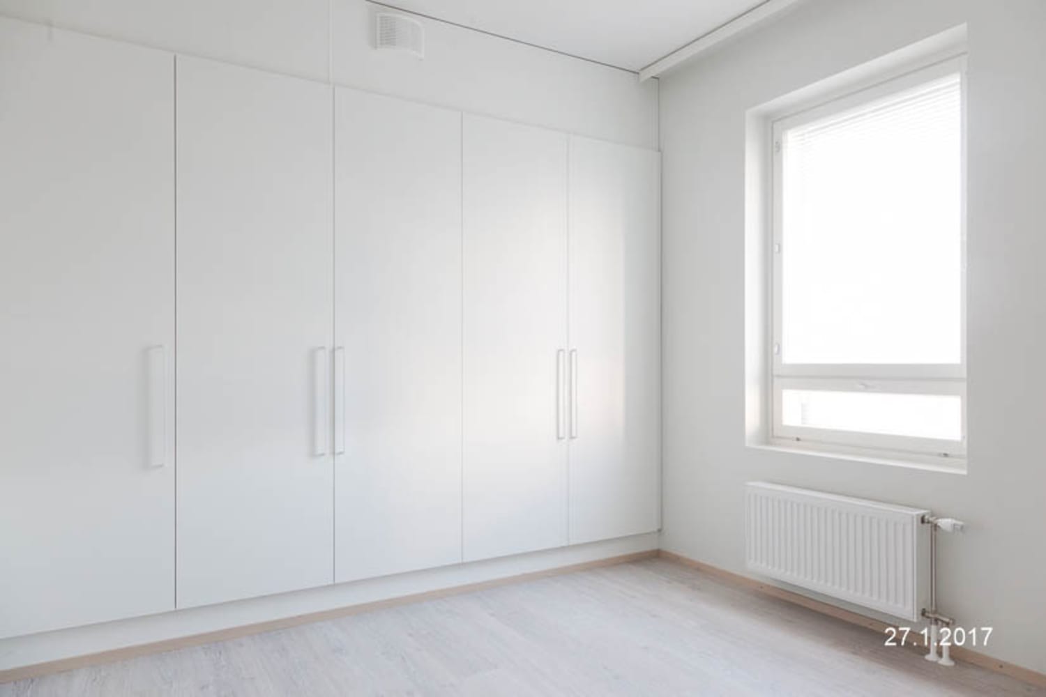 The floors of the living areas are laminate resembling bleached oak planks. The walls and closet furniture are white. The kitchen features white cabinet doors and a spicy yellow tiling between the upper and lower cabinets. The worktop is laminate with a grey oak tone. Equipment includes a ceramic hob, dishwasher, and freezer-refrigerator. In the bathroom, the walls are mostly white and the floors are grey tiles. The harmonious colour scheme is enlivened by yellow mosaic tiles on the accent wall. There is provision for a washing machine and dryer.
