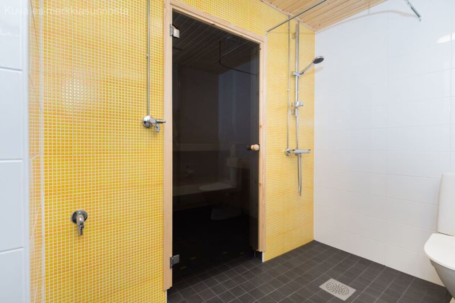 In the bathroom, the walls are mainly white and the floors are grey tiles. The harmonious colour scheme is brightened by yellow mosaic tiles on the feature wall. There are provisions for a washing machine and tumble dryer.