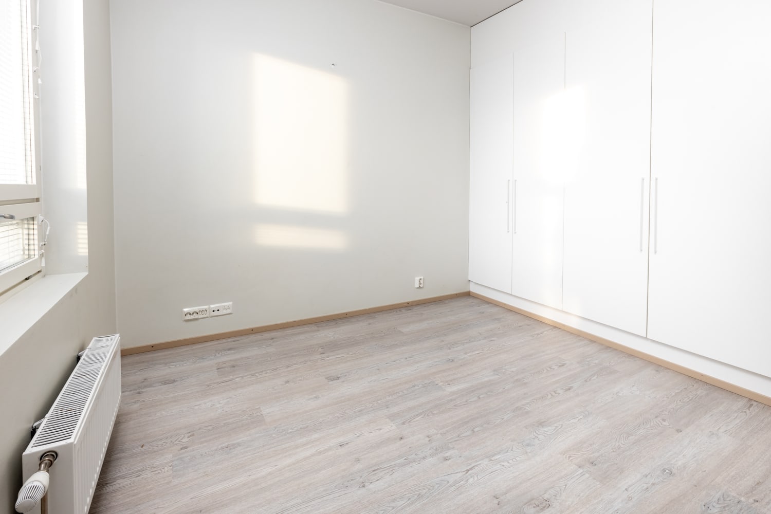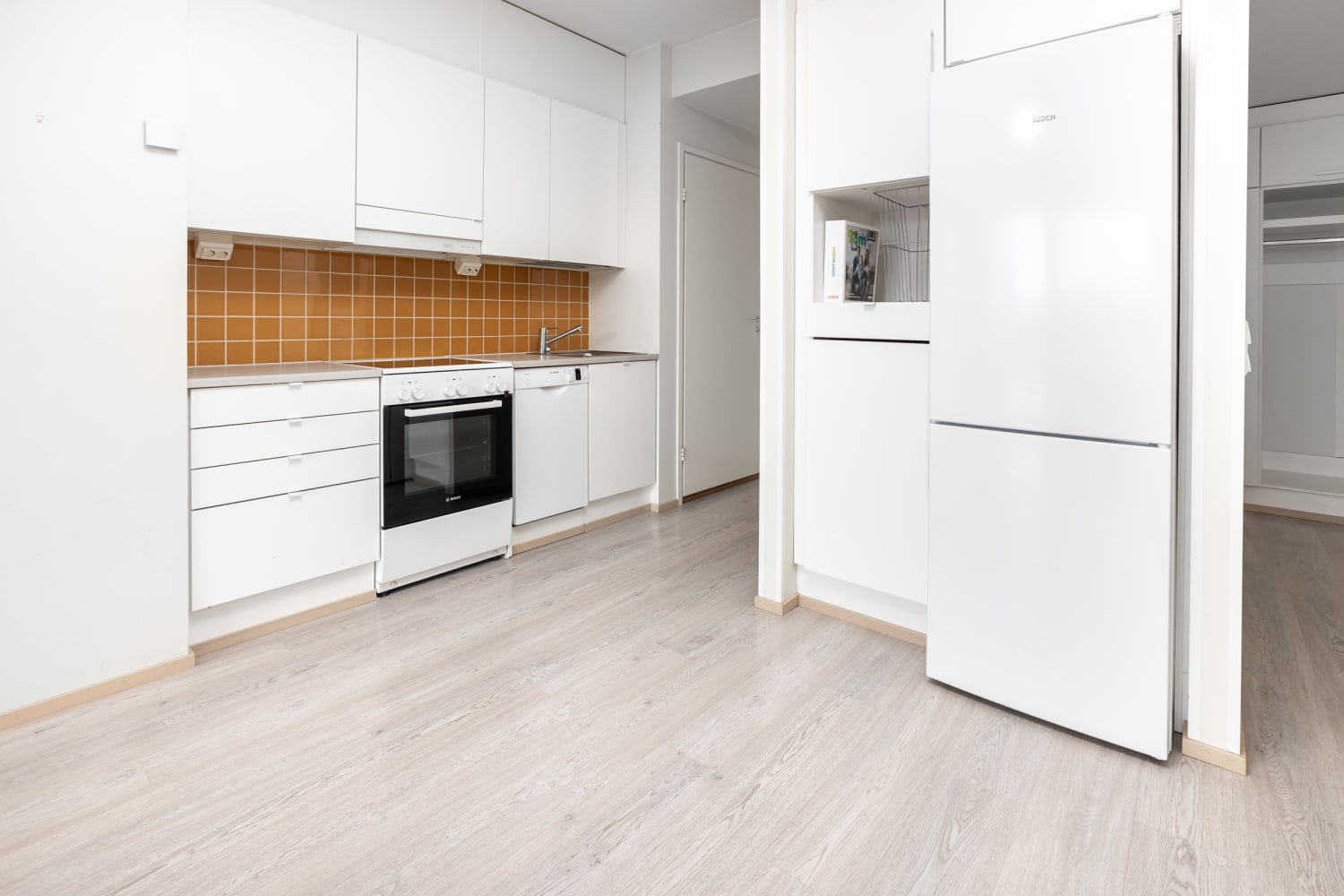 The floors in the living areas are laminate resembling bleached oak planks. The walls and cupboard furniture are white. In the kitchen, the cabinet doors are white, with a spicy yellow tiling between the upper and lower cabinets. The worktop is grey oak-toned laminate. The kitchen is equipped with a ceramic stove, dishwasher, and freezer-refrigerator.