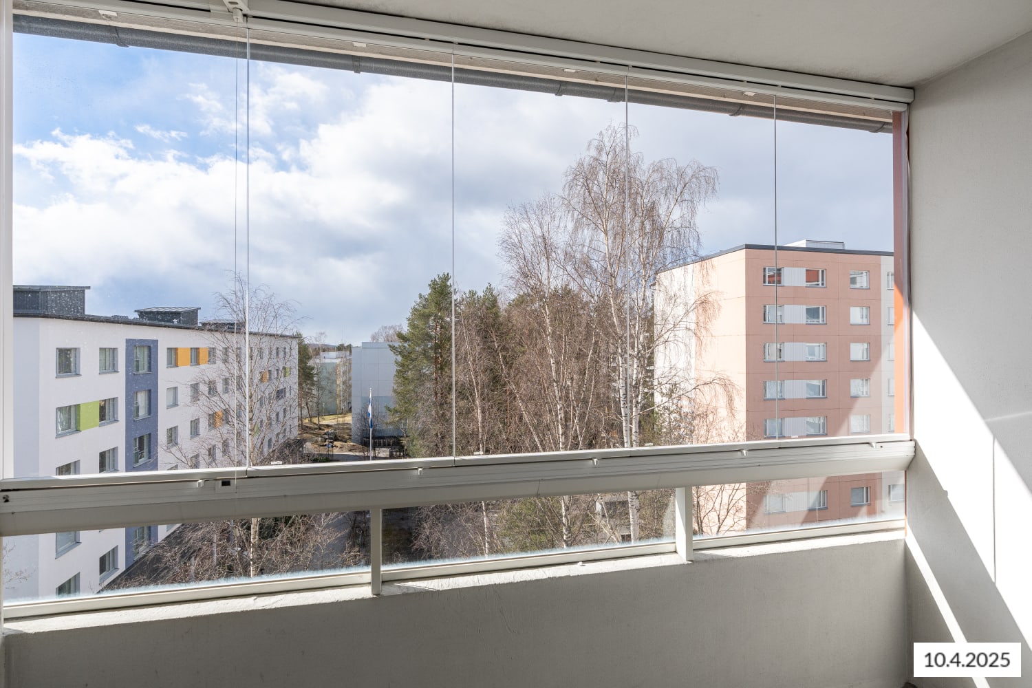 This five-storey building is located in southern Hervanta. The building was completed in 1979 and refurbished in 2005. There are a total of 45 apartments, all with a glassed-in balcony. Tampere city centre is around 9 km away, and the bus links are excellent. There are lots of services, schools, day care centres, etc. The population of Hervanta is a little over 25,000 but, the students and employees of the various educational institutions bring the daily number of people to more than 30,000.