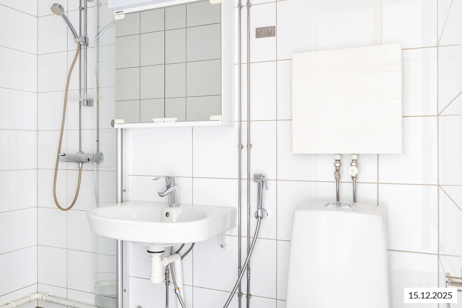 The bathroom features durable and beautiful Finnish Kide collection fixtures. The modern bathroom is fully tiled and includes space for a washing machine.