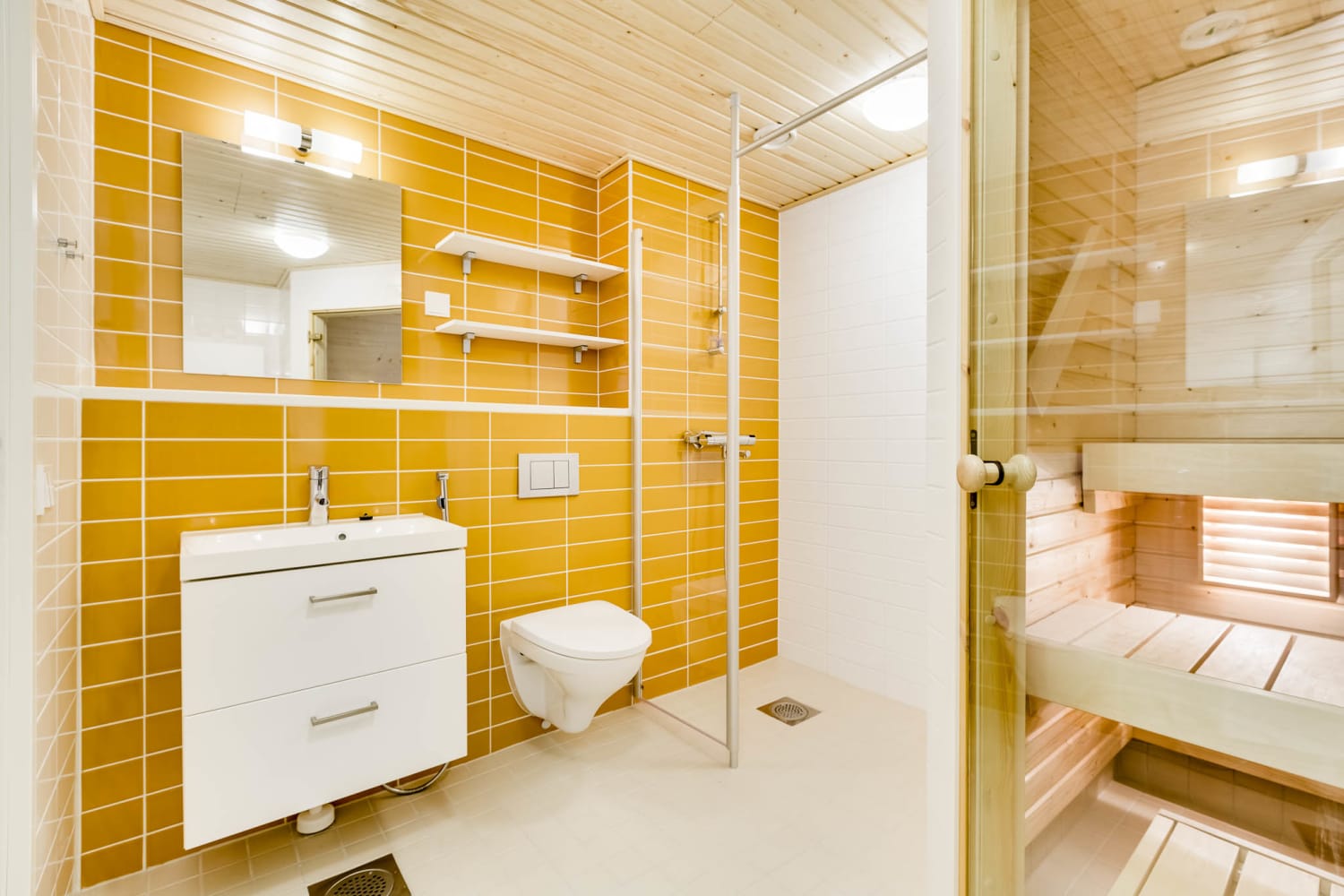 The floors of the fresh-toned apartment are wide laminate planks resembling pine shades. The kitchens feature white cabinets and light oak-coloured laminate countertops with built-in stainless steel sinks. The space between the cabinets and the counter is tiled with white tiles. The kitchen is equipped with a stove, dishwasher, freezer-refrigerator, and a microwave reservation. The appliances are white. The bathroom has large white wall tiles, complemented by a yellow-tiled accent wall. The floor tiles are beige. There is provision for a washing machine and tumble dryer.