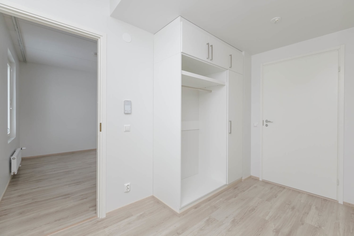 This clear one-bedroom home is located at the end of the building on the top floor, with windows facing two directions. The apartment does not have a living room but features a large kitchen area and a separate bedroom. The space opens up to a juliet balcony facing Tieteenkatu.