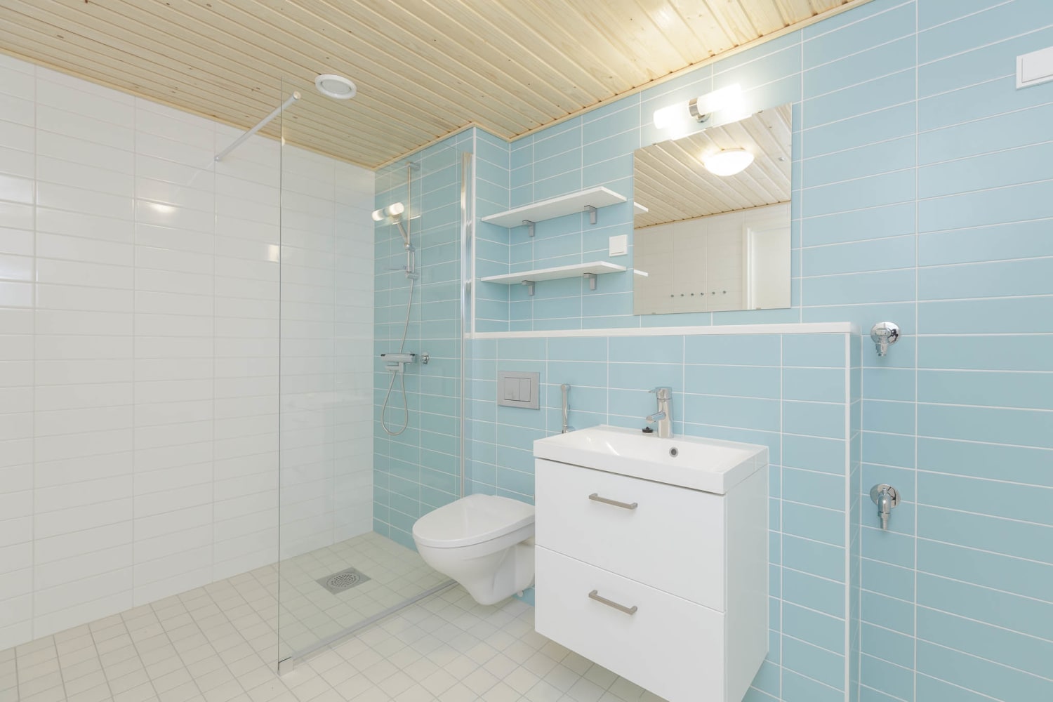 The bathroom has large white wall tiles, accented with a turquoise tiled feature wall. The floor tiling is in a natural white colour. There is a reservation for a washing machine and a tumble dryer.