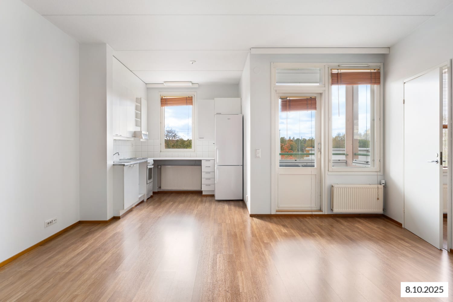 In the kitchen, there's ample space for the home cook to work, and a proper dining table fits well in the area. The kitchen cabinets are fresh white, with the space between the upper and lower cabinets tiled with white tiles. The kitchen is equipped with a stove and freezer-refrigerator, and a dishwasher can be installed if desired. The appliances are white.