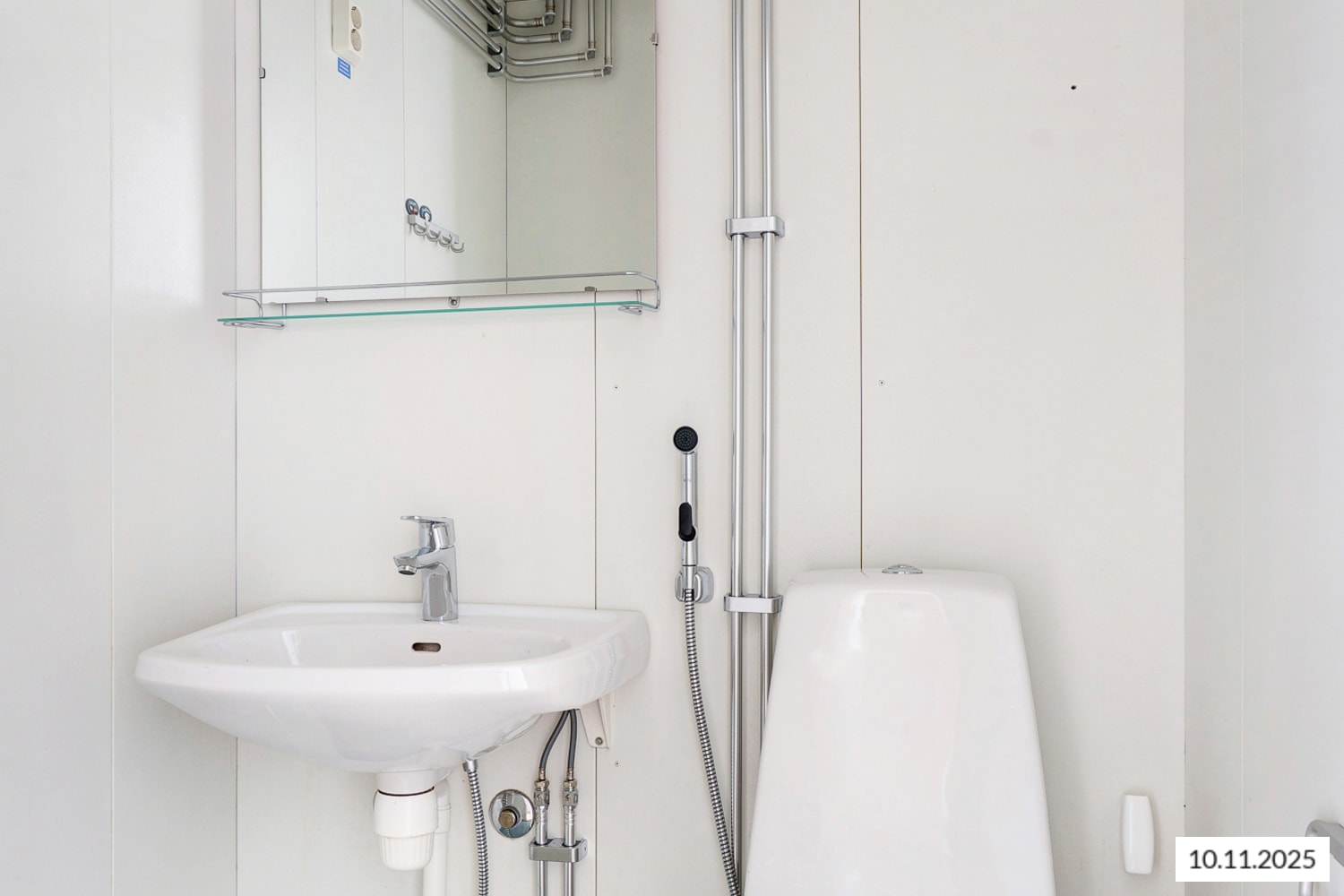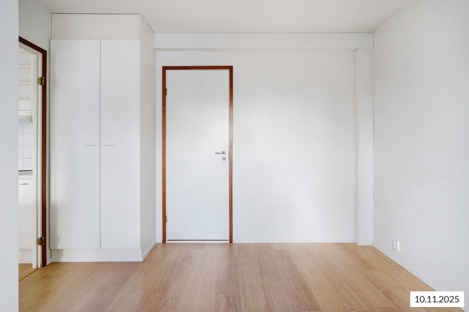The apartment features a private sauna and a practical, separate toilet. There's ample storage space in both the hallway and the bedroom.