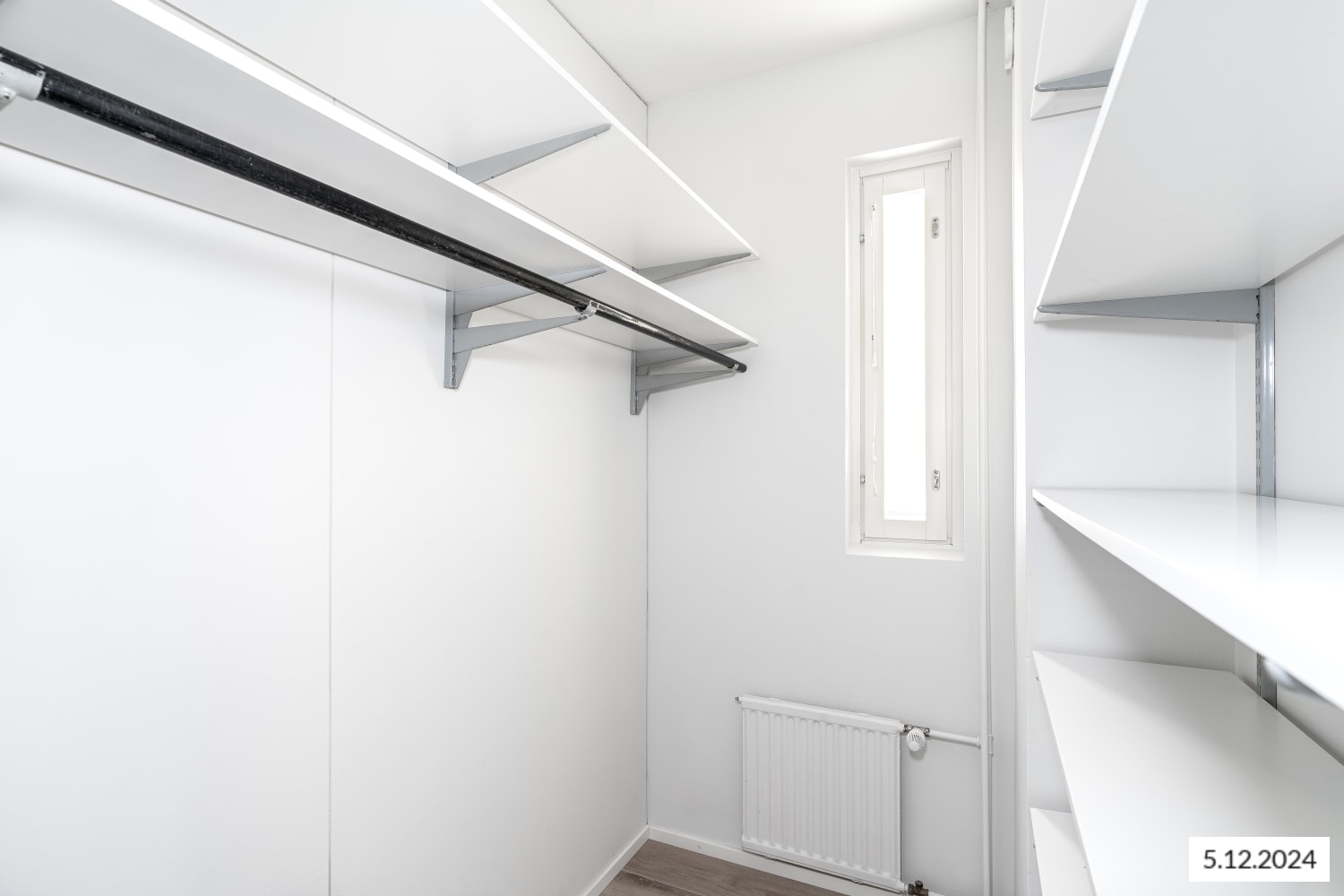 This through two-bedroom apartment features an easily furnishable and traditional layout. The home has two bedrooms, a separate kitchen, and a balcony off the living room. A separate walk-in closet ensures plenty of storage space. The apartment also has a separate WC and bathroom, with space for a washing machine in the bathroom.